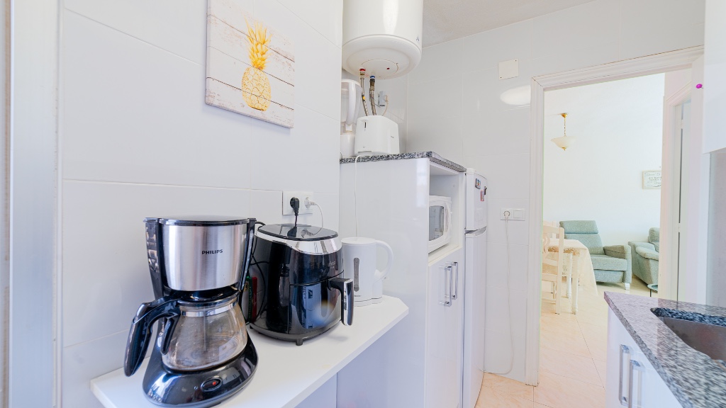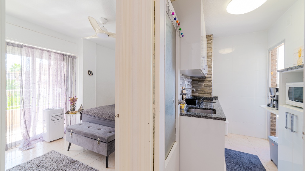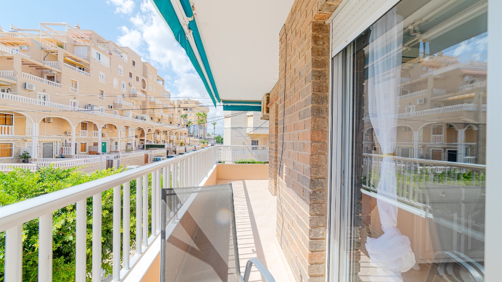 For sale apartment in Punta Prima, Costa Blanca The apartment for sale consists: Entrance hallway, shower room, spacious living/dining room, fully renovated modern fitted kitchen complete with appliances, small side balcony, two double bedrooms both with fitted wardrobes and a large balcony complete with brand new awnings (toldos). The building benefits from secure external parking which is accessed by al electric gate, there is also a huge communal roof terrace with stunning views of the surrounding areas and there is also a lift in the building. The property has been lovingly renovated by the current owners including new furniture, there are also new ceiling fans and there is air conditioning. Punta Prima location is superb with a huge selection of bars, restaurants and shops just a couple of minutes walk away, as well as being so close to the sea!