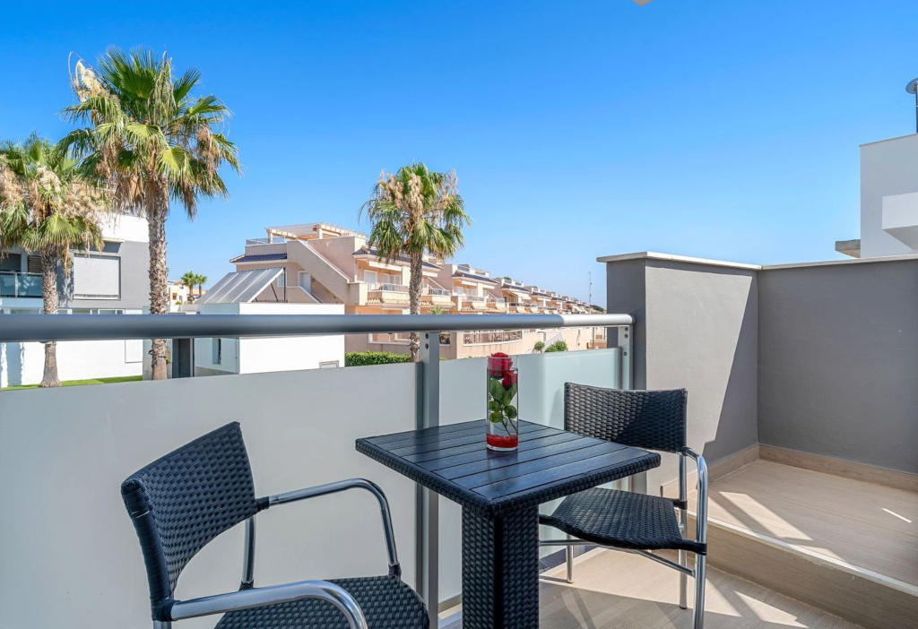 For sale is a charming bungalow located on the top floor in the desirable area of Punta Prima, in the gated community "Amay". This resale property offers 65 m² of well-designed internal space, featuring 2 cozy bedrooms and 2 modern bathrooms.The apartment is equipped with ducted air conditioning for both cooling and heating, ensuring comfort in every season. It is sold fully furnished and ready to move into.A dedicated parking space in the communial area is also included. Built in 2012, the property is ready for you to move in.Punta Prima is a vibrant community known for its stunning beaches and beautiful coastal views. It boasts a variety of amenities, including restaurants, cafes, and shops, all within easy reach. This area is perfect for those who appreciate a relaxed lifestyle while still being close to the hustle and bustle of nearby attractions. You can also enjoy the communal swimming pool, providing a refreshing escape just steps away from your home.Conveniently located makes it easy to explore the surrounding areas. Additionally, the property comes equipped with a central AC system to keep you comfortable throughout the year.