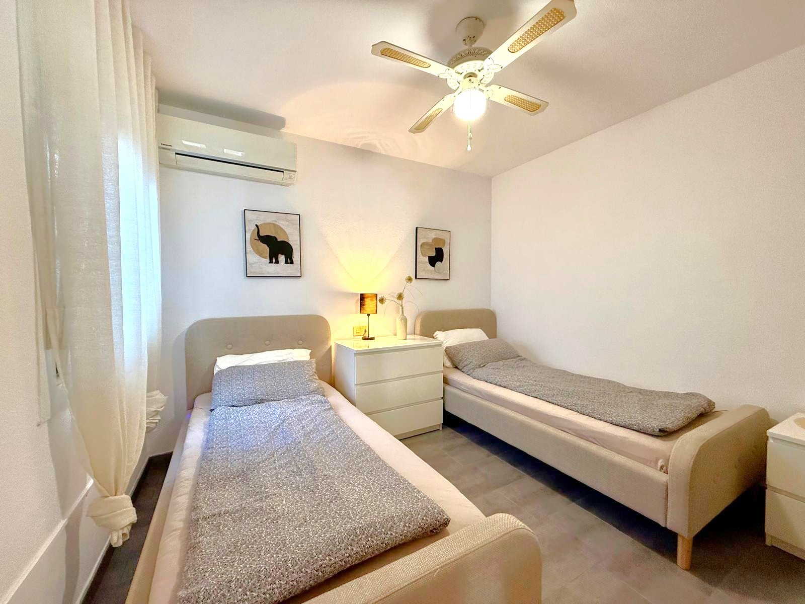 Top quality terraced house in the popular residential Verdemar, at only 300 m distance to supermarket, shops, restaurants, bars, pharmacy, etc. The house has by its entrance a Breakfast balcony where you have your morning coffee as the sun rises in the east. The open plan living-, dining and kitchen area opens towards the south west facing balcony overlooking the green area in front. 3 double bedrooms and 2 bathrooms At the upper floor level is a solarium with sea view, and a handy storage unit for terrace furniture etc. The property is sold furnished (subject to inventory), white goods and with AC Price: 319.000€