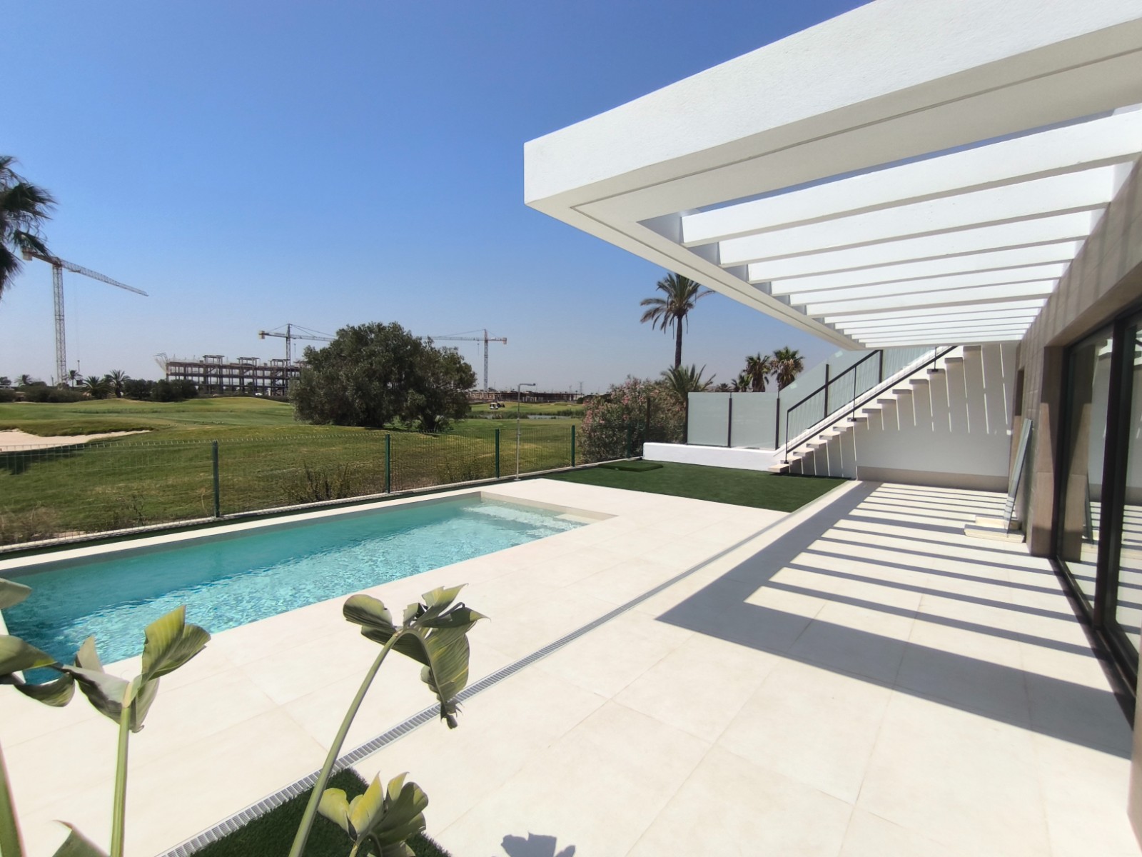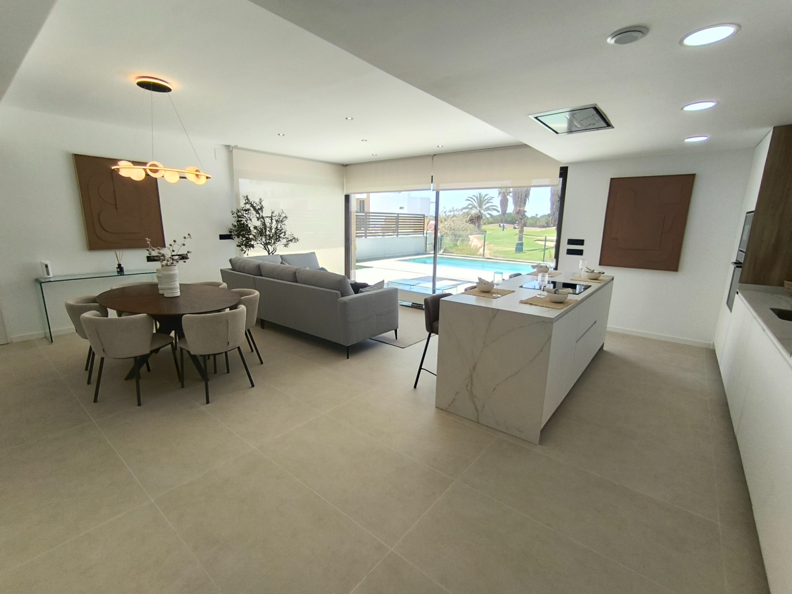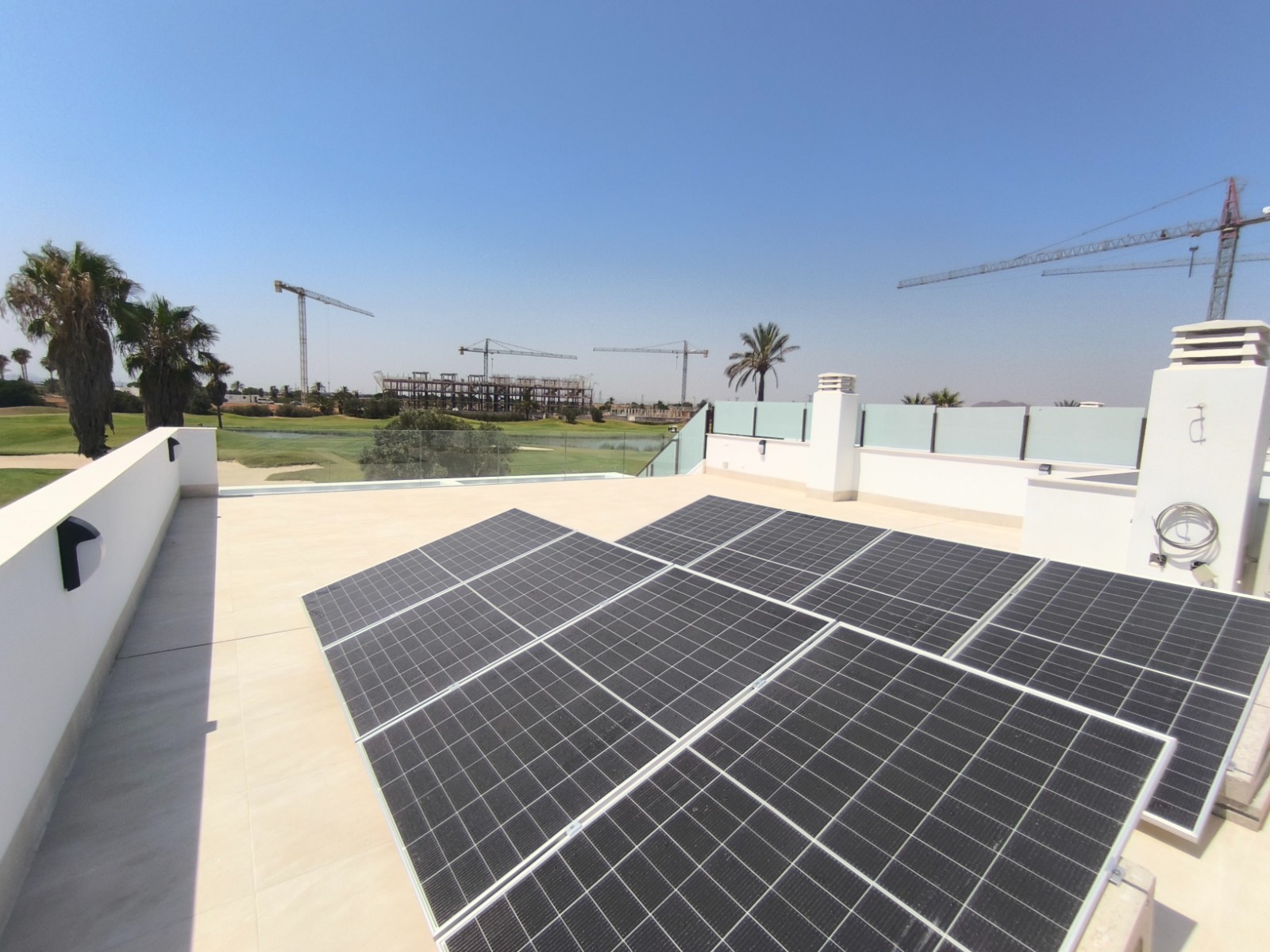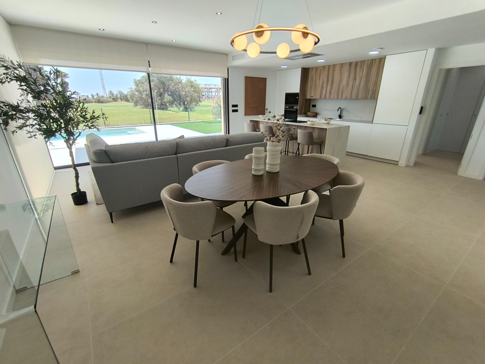 Exclusive contemporary villa with spectacular views of the Serena golf course. The property offers 4 bedrooms and 3 bathrooms, as well as a fully finished basement that includes a garage, bedroom, laundry area, and bathroom. Enjoy your own private pool and a spacious solarium, perfect for making the most of the Mediterranean climate. The open-plan kitchen is equipped with a Neolith worktop, under-mount sink, and single-lever faucet, designed within a modern and functional space. Key features include: Electric shutters. Pre-installation for ducted air conditioning. 150L aerothermal system for hot water. 8kWp photovoltaic installation with 6kWp inverter. White lacquered interior carpentry and built-in wardrobes with drawers. Grey aluminum exterior carpentry with thermal break and double-glazed Climalit windows. Bathrooms with resin shower trays, built-in black faucets, and suspended porcelain sinks. Located in one of the most sought-after areas of the Costa del Mar Menor, the property offers a peaceful and exclusive setting, with all services nearby and excellent access to the motorway. A unique opportunity to live in style and comfort in a privileged enclave.