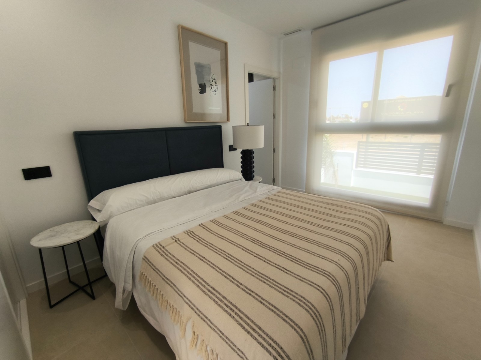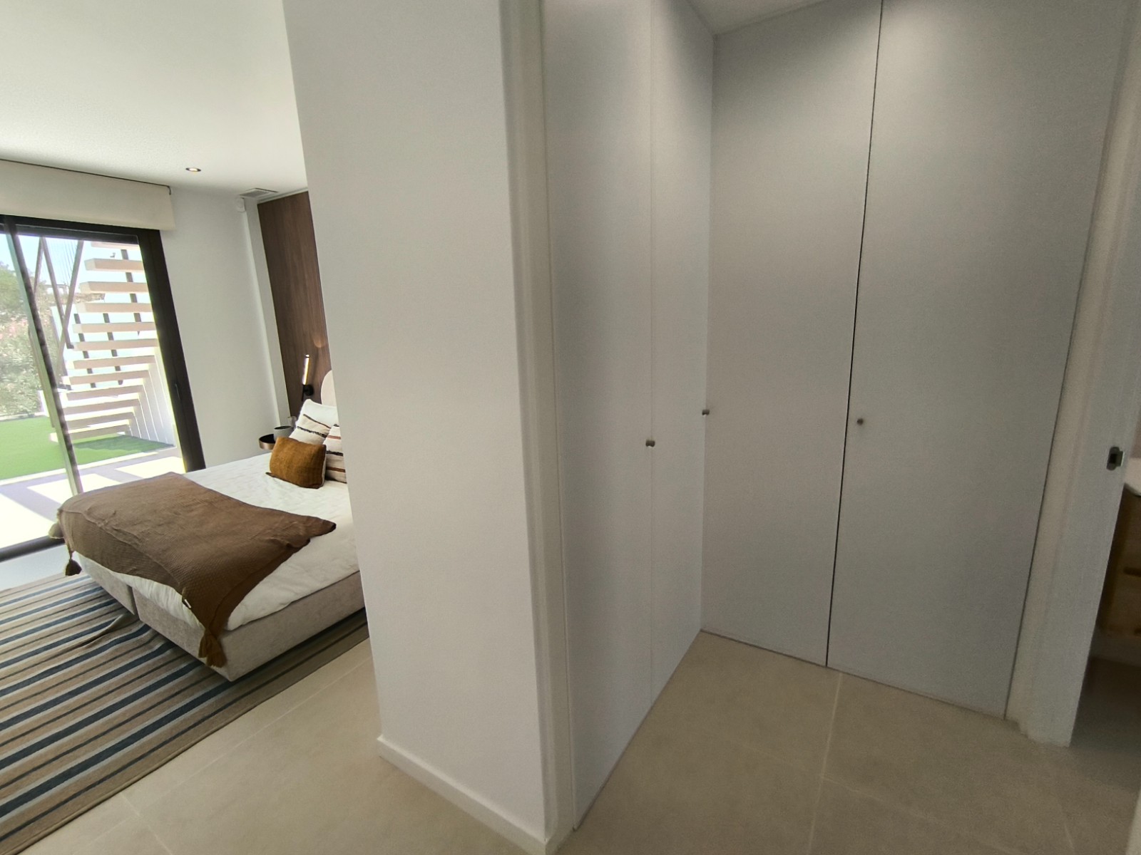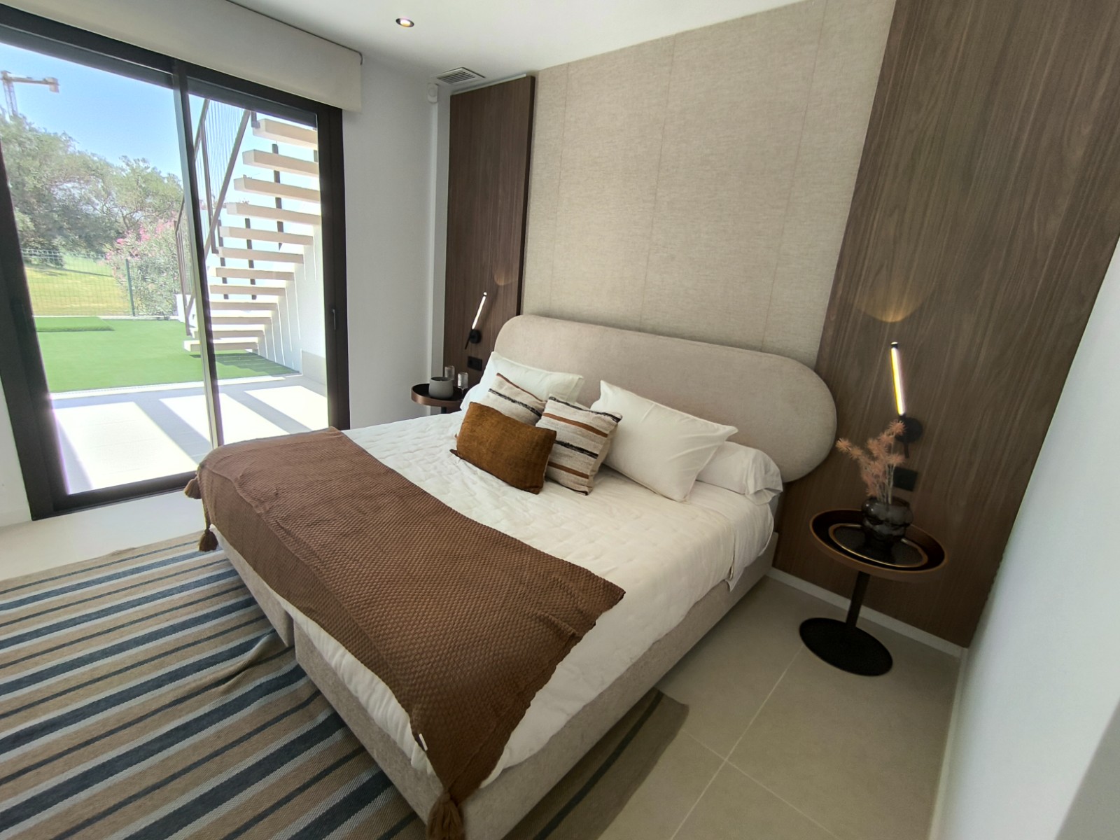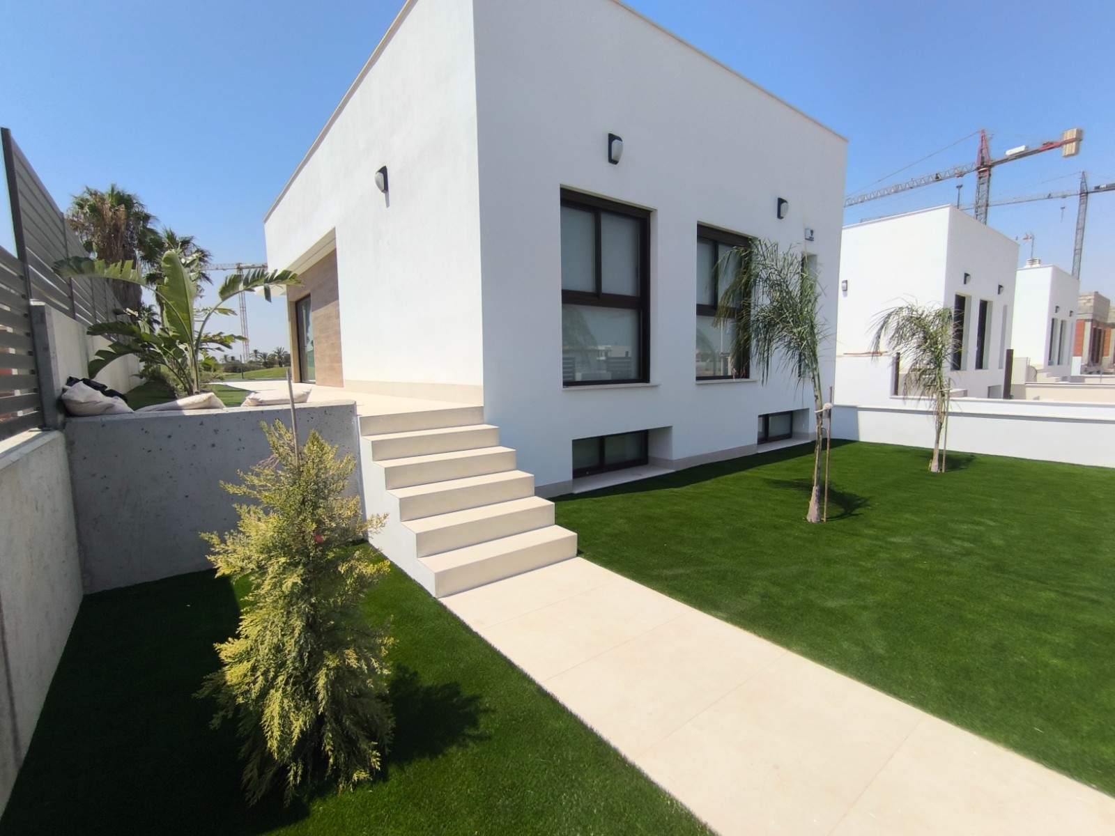 Exclusive contemporary villa with spectacular views of the Serena golf course. The property offers 4 bedrooms and 3 bathrooms, as well as a fully finished basement that includes a garage, bedroom, laundry area, and bathroom. Enjoy your own private pool and a spacious solarium, perfect for making the most of the Mediterranean climate. The open-plan kitchen is equipped with a Neolith worktop, under-mount sink, and single-lever faucet, designed within a modern and functional space. Key features include: Electric shutters. Pre-installation for ducted air conditioning. 150L aerothermal system for hot water. 8kWp photovoltaic installation with 6kWp inverter. White lacquered interior carpentry and built-in wardrobes with drawers. Grey aluminum exterior carpentry with thermal break and double-glazed Climalit windows. Bathrooms with resin shower trays, built-in black faucets, and suspended porcelain sinks. Located in one of the most sought-after areas of the Costa del Mar Menor, the property offers a peaceful and exclusive setting, with all services nearby and excellent access to the motorway. A unique opportunity to live in style and comfort in a privileged enclave.