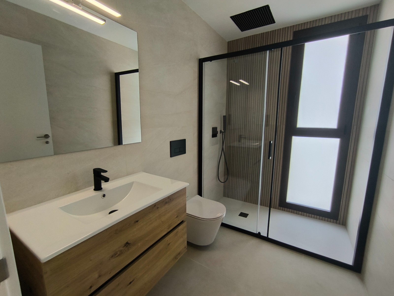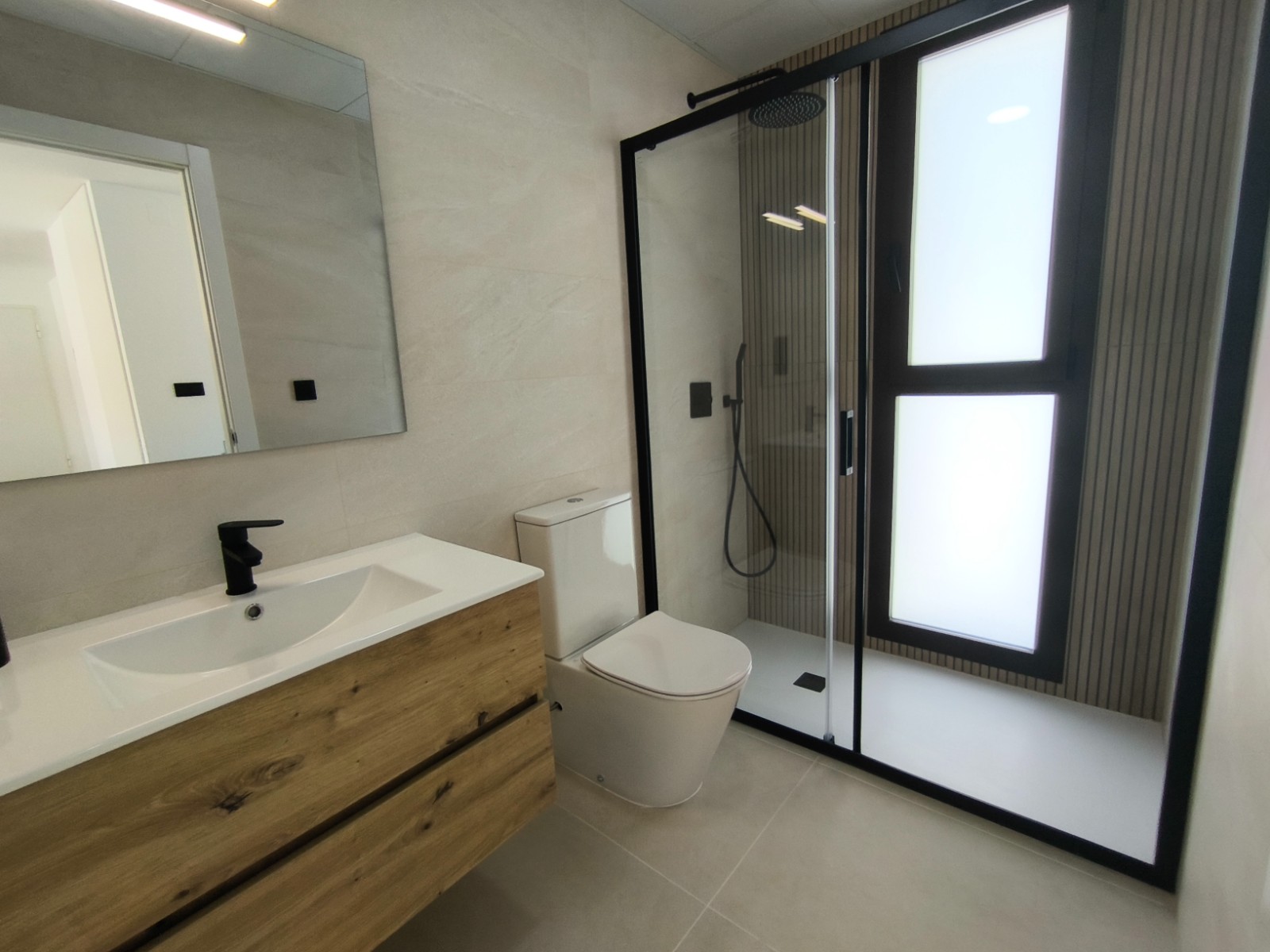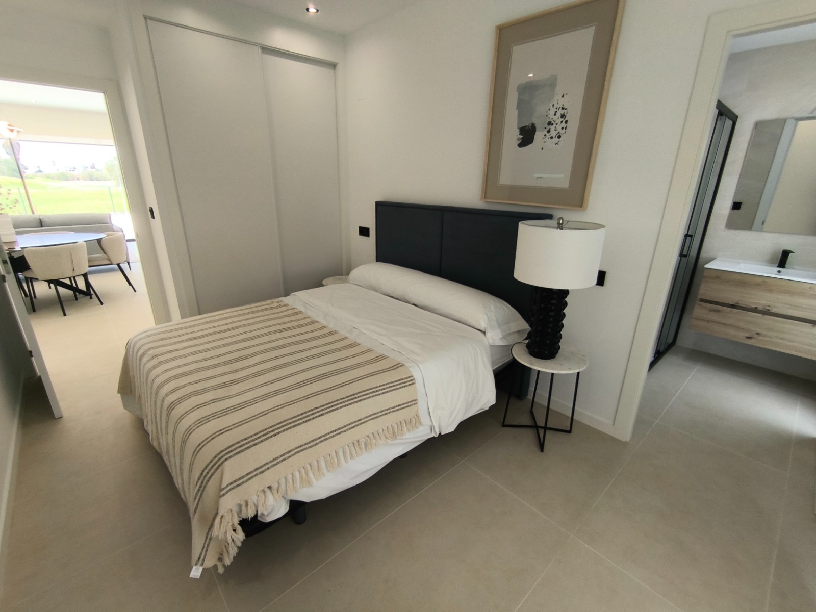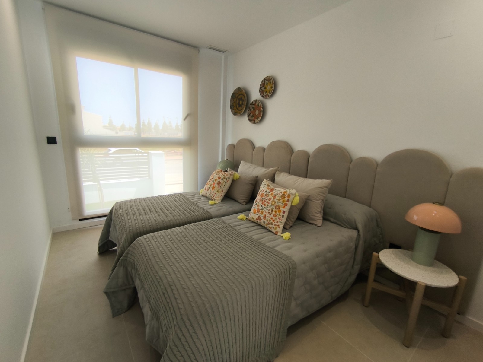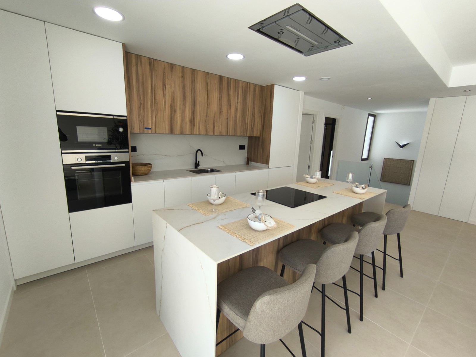 Exclusive contemporary villa with spectacular views of the Serena golf course. The property offers 4 bedrooms and 3 bathrooms, as well as a fully finished basement that includes a garage, bedroom, laundry area, and bathroom. Enjoy your own private pool and a spacious solarium, perfect for making the most of the Mediterranean climate. The open-plan kitchen is equipped with a Neolith worktop, under-mount sink, and single-lever faucet, designed within a modern and functional space. Key features include: Electric shutters. Pre-installation for ducted air conditioning. 150L aerothermal system for hot water. 8kWp photovoltaic installation with 6kWp inverter. White lacquered interior carpentry and built-in wardrobes with drawers. Grey aluminum exterior carpentry with thermal break and double-glazed Climalit windows. Bathrooms with resin shower trays, built-in black faucets, and suspended porcelain sinks. Located in one of the most sought-after areas of the Costa del Mar Menor, the property offers a peaceful and exclusive setting, with all services nearby and excellent access to the motorway. A unique opportunity to live in style and comfort in a privileged enclave.
