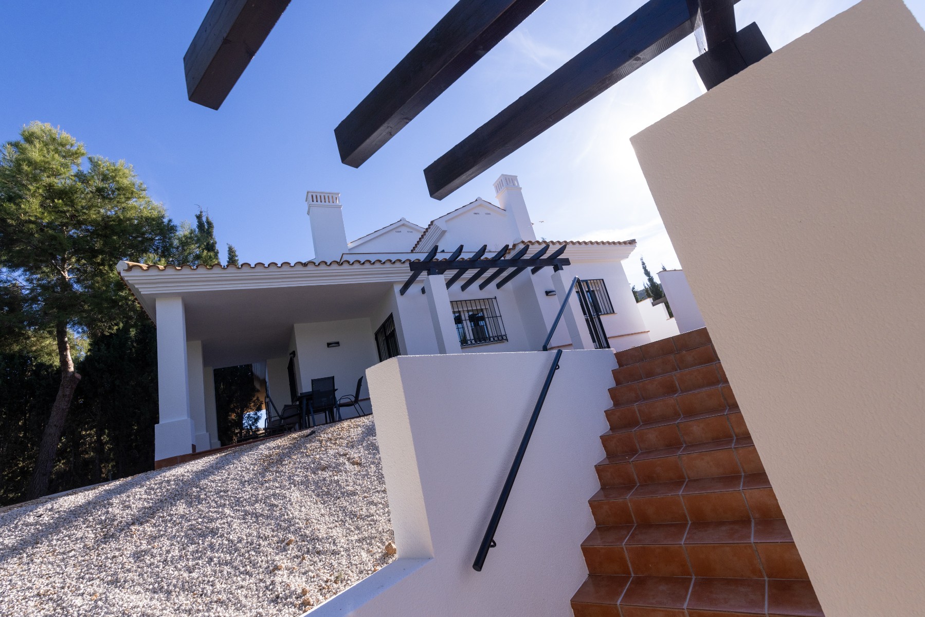 Explore the exclusivity of Altos de las Palas, Fuente Álamo, Murcia, in our three-bedroom, two-bathroom villas. These exceptional residences are designed around an interior courtyard that provides spaciousness and light, creating a cozy atmosphere connected to the surrounding nature. Enjoy the panoramic view from the rooftop terrace, a perfect place to relax and contemplate the landscapes that surround you. The architecture reflects the charm of traditional Mediterranean style, blending the classic with modern and respectful design. Each villa features two generous porches that extend your living spaces outdoors, all framed by a spacious plot of 800 square meters. Immerse yourself in the tranquility of nature while experiencing top-notch quality in every corner of your home. Community pool. The kitchen, fully furnished and equipped with modern appliances, becomes the heart of the home, where functionality meets elegance. Security is guaranteed with a reinforced door that offers peace of mind and protection. The villas are carefully finished. The entrance door with both sides paneled in rustic pine wood. The interior carpentry of rustic Castilian pine wood adds an authentic and warm touch to your home. Experience brightness in every corner, where the spaces are designed to maximize the entry of natural light. These villas not only offer a residence but a lifestyle where comfort meets elegance, all within the wonderful surroundings of beautiful Murcia.