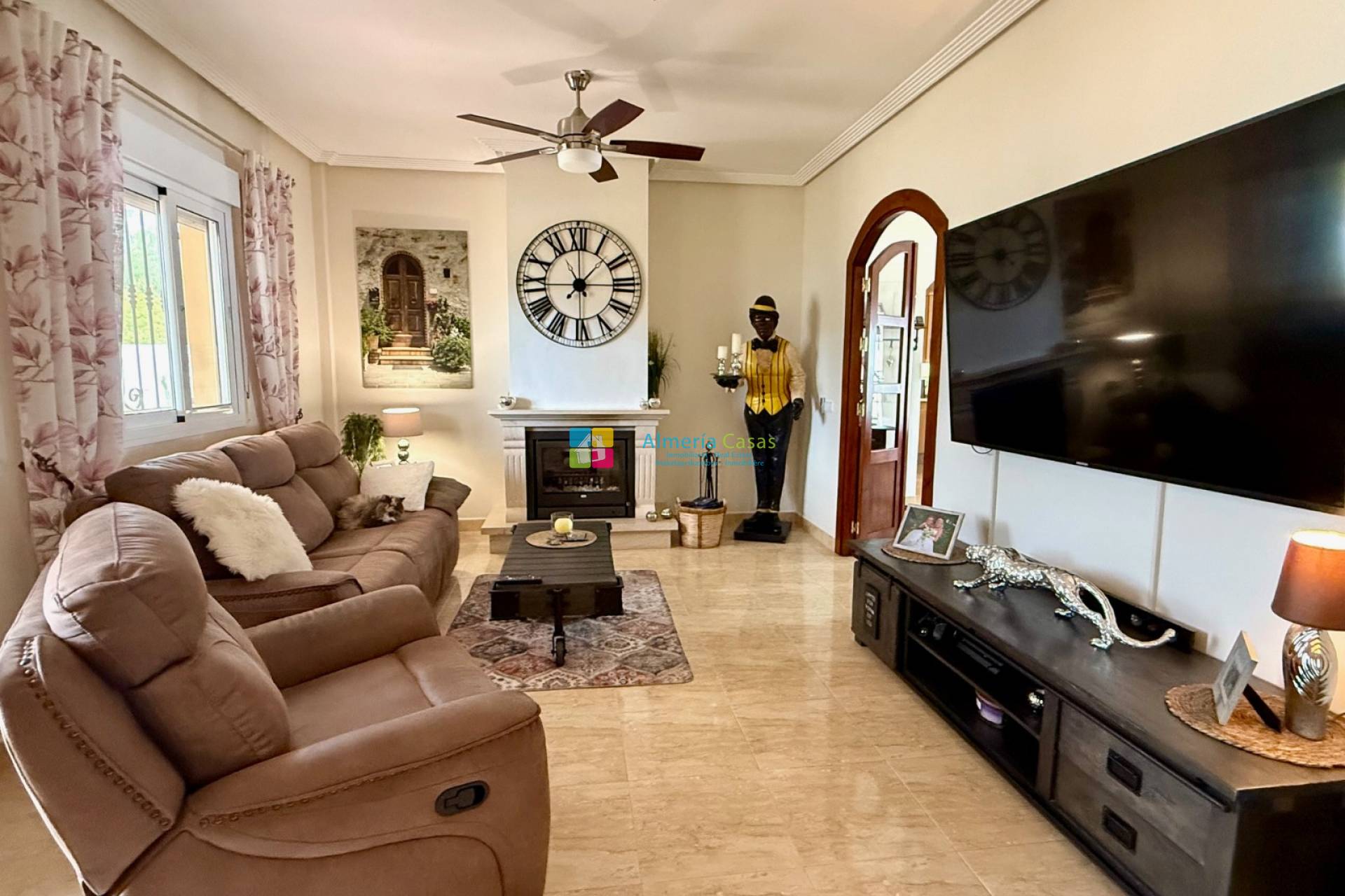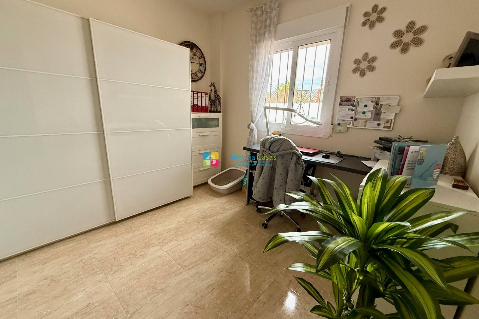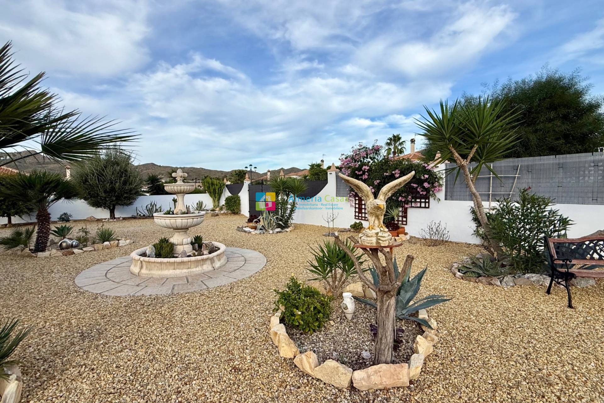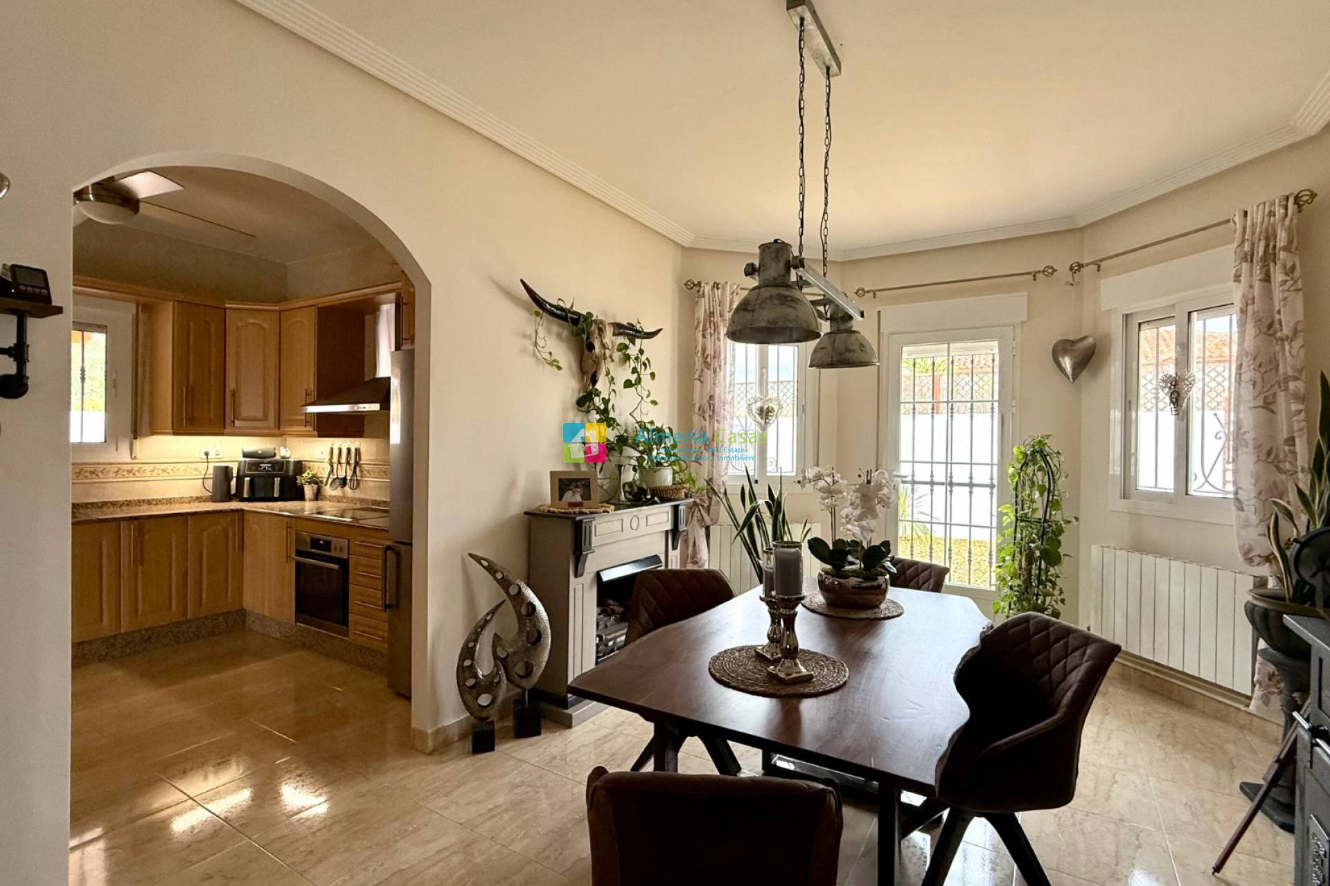 À seulement 7 minutes en voiture du village d'Arboleas d'un côté, et de la ville plus importante d'Albox de l'autre, cette propriété bénéficie d'une situation centrale idéale, offrant un accès facile à toutes les commodités : médecins, centre médical ouvert 24h/24, pharmacies, bureau de poste, installations sportives, supermarchés, commerces, banques, bars à tapas et restaurants avec terrasse, salles de sport et marchés hebdomadaires. La côte méditerranéenne est à 35-45 minutes en voiture, et trois aéroports (Almeria, Murcie et Alicante) sont facilement accessibles par autoroute. La villa se trouve à quelques pas d'un bar à tapas-restaurant très fréquenté, véritable lieu de rencontre convivial et de convivialité. Le terrain est entièrement clos de murs et dispose d'un double portail donnant sur une allée gravillonnée menant à un garage indépendant de 21 m² avec porte basculante. L'espace est suffisant pour garer plusieurs véhicules hors route, y compris un camping-car si nécessaire. Les jardins, magnifiquement entretenus, sont recouverts de gravier pour un entretien facile. Ils abritent une variété d'arbres fruitiers, de plantes et d'arbustes méditerranéens, ainsi qu'un point d'eau. Une piscine de 8 x 4 mètres, entourée d'une terrasse, invite à la détente et aux bains de soleil. Sur le côté, une pagode couverte offre un espace ombragé idéal pour se relaxer et recevoir en extérieur. Un passage voûté mène à une autre gloriette et au jardin arrière, planté d'arbustes. À l'avant de la villa, une terrasse couverte de 8 mètres de long offre un coin salon ombragé d'où l'on peut admirer la vue sur les montagnes. Cette vue est également visible depuis les jardins et la piscine. Deux stores rétractables permettent de se protéger du soleil en plein été. Derrière le garage se trouvent un abri en parpaings pour les outils et le bois, ainsi que la cuve à fioul du chauffage central et une réserve d'eau chaude. Depuis la terrasse couverte, la porte d'entrée donne accès à la villa. Une autre porte, également depuis la terrasse carrelée, mène à la buanderie. La villa offre 146 m² de surface habitable et comprend une buanderie avec une large arche donnant sur une cuisine entièrement équipée avec plans de travail en granit. De là, une autre arche mène à une salle à manger indépendante avec une porte d'accès au jardin. De magnifiques portes cintrées en bois relient la salle à manger au spacieux salon, agrémenté d'une cheminée à bois et d'une porte donnant sur la terrasse couverte. Un couloir intérieur, attenant au salon, dessert deux chambres d'amis (l'une avec placards intégrés et l'autre actuellement aménagée en dressing et bureau), une salle de bains familiale et la suite parentale, avec portes-fenêtres donnant sur le jardin et salle de douche privative. Cette villa haut de gamme, construite par l'un des constructeurs les plus prestigieux de la région, offre de nombreux atouts. Elle est disponible à la vente, partiellement meublée avec du mobilier de qualité (sous réserve de négociation). Pour plus d'informations ou pour organiser une visite, veuillez contacter l'équipe d'Almeria Casas.