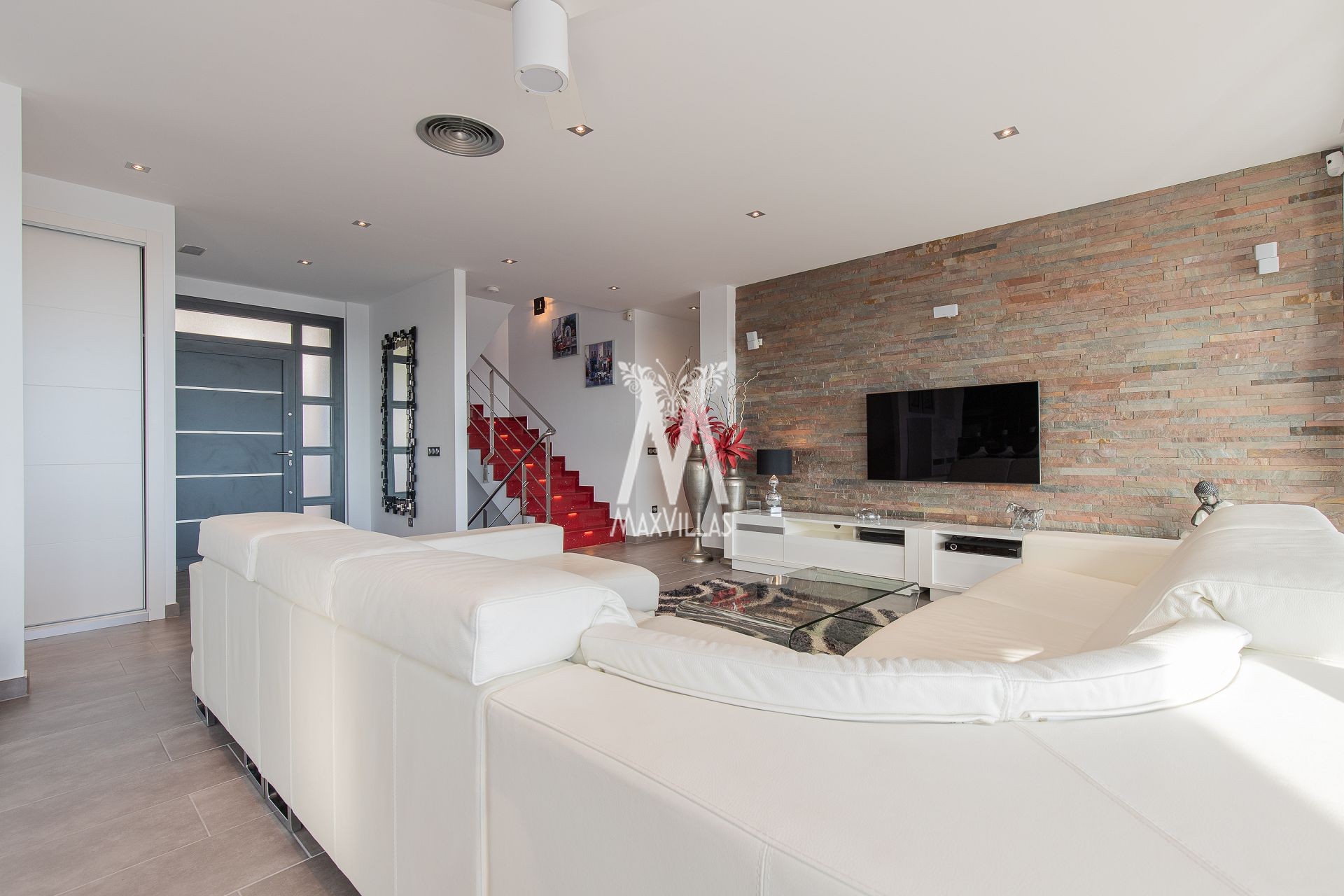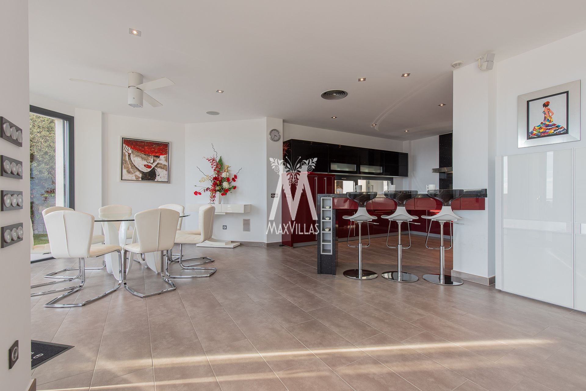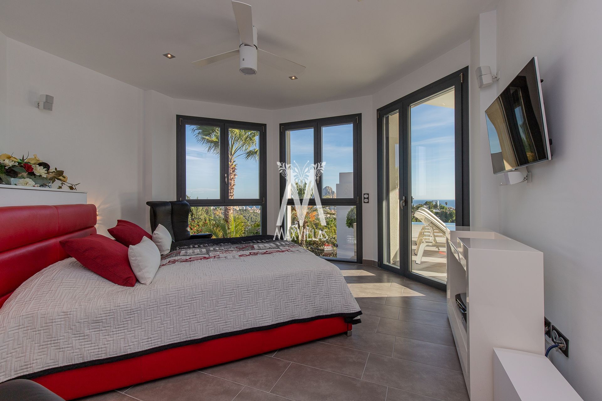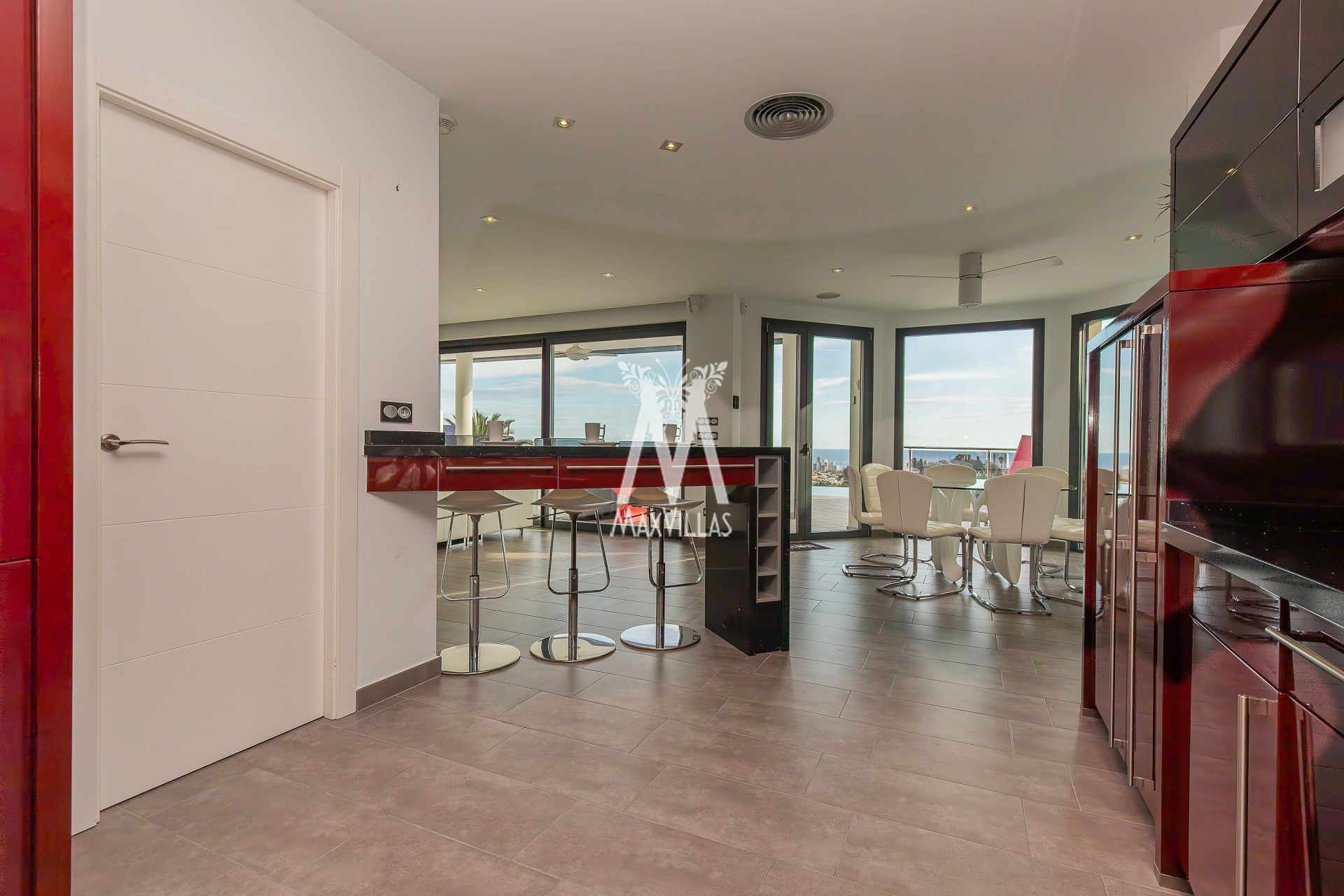Découvrez cette propriété exclusive dans l’un des quartiers les plus recherchés de Calpe, alliant confort, élégance et tranquillité absolue. Avec des vues imprenables sur la mer Méditerranée et le Peñón de Ifach, cette villa conjugue luxe et durabilité jusque dans les moindres détails. Disposition et espaces : Rez-de-chaussée : Grand salon-salle à manger avec accès à une terrasse panoramique, cuisine entièrement équipée avec électroménagers haut de gamme (MIELE), et une spectaculaire piscine à débordement au sel avec couverture électrique, douche extérieure, espace barbecue et pergola. Ce niveau comprend également deux chambres (dont une en suite avec dressing) avec accès à la terrasse, ainsi qu’un garage fermé. Étage inférieur : Deux chambres en suite avec salles de bains privées, une charmante cave à vin de style rustique, un grand garage pouvant accueillir jusqu’à six véhicules et une pièce polyvalente idéale pour une salle de sport, un home cinéma ou une salle de jeux. Étage supérieur : Solarium équipé d’un système de panneaux solaires avec une capacité journalière de 50 kWh, garantissant efficacité et durabilité dans toute la maison. Extérieur : Jardins nécessitant peu d’entretien avec arrosage automatique, pelouse naturelle et arbres fruitiers pour apporter fraîcheur et verdure. Le terrain est délimité par des murs en béton habillés de pierre naturelle grise. Matériaux et équipements de haute qualité : La villa est construite en briques d’argile avec isolation extérieure, garantissant une haute efficacité énergétique et un confort thermique optimal. Chauffage au sol alimenté par panneaux solaires, climatisation, systèmes audio (BOSE) et TV dans toutes les pièces. Emplacement privilégié : À seulement 2,5 km du centre de Calpe et à 3 km des plages, cette villa bénéficie d’un emplacement stratégique offrant intimité, calme et proximité des commodités. Une opportunité unique : Vivez dans une villa qui a tout : luxe, confort et intimité totale. Contactez-nous pour plus d’informations ou pour organiser une visite privée !