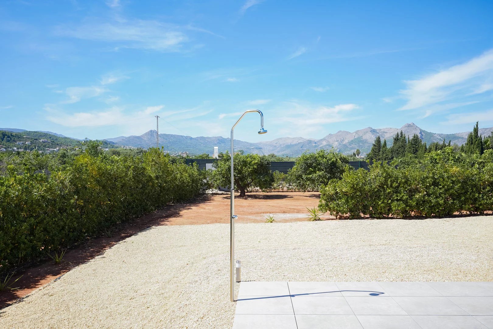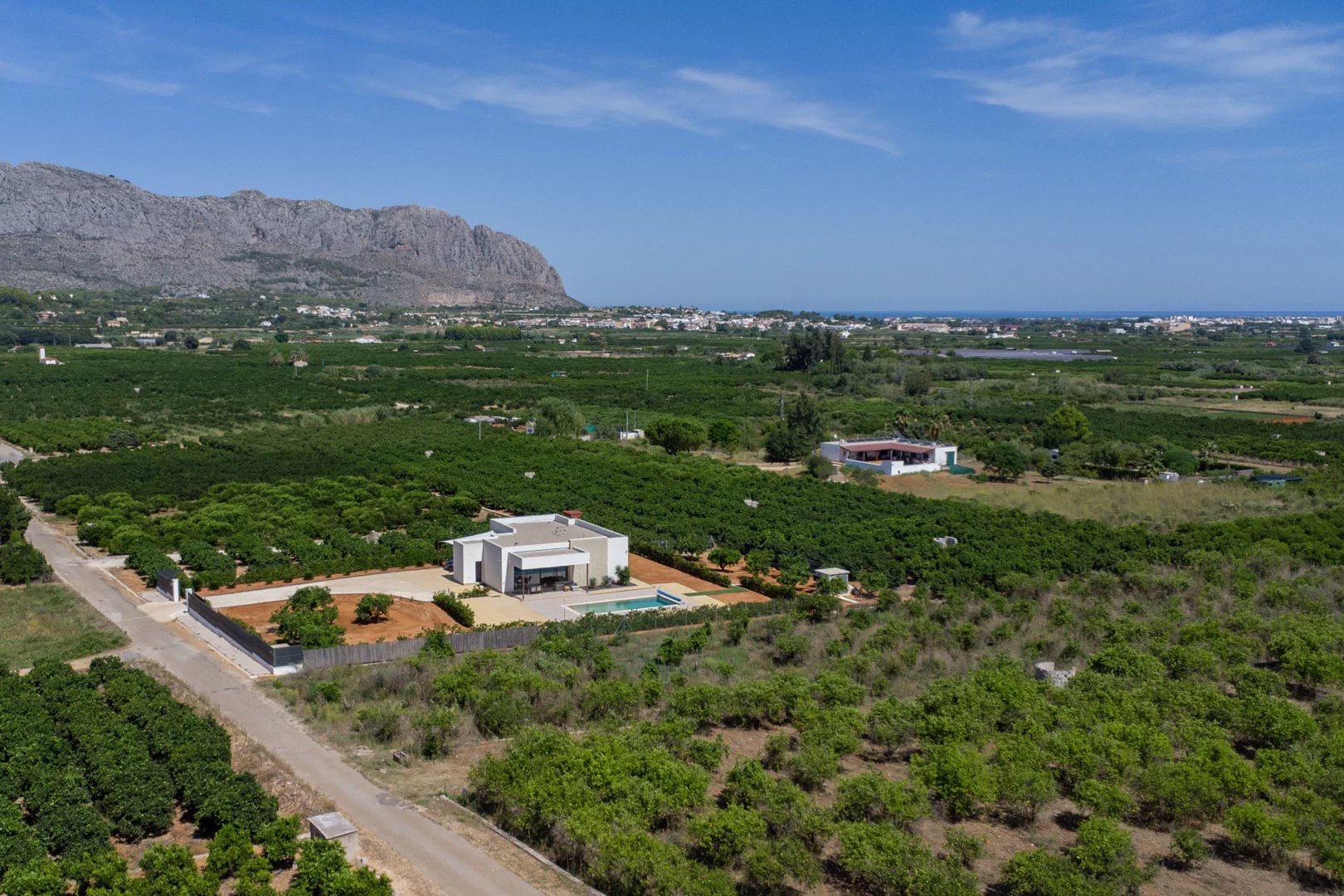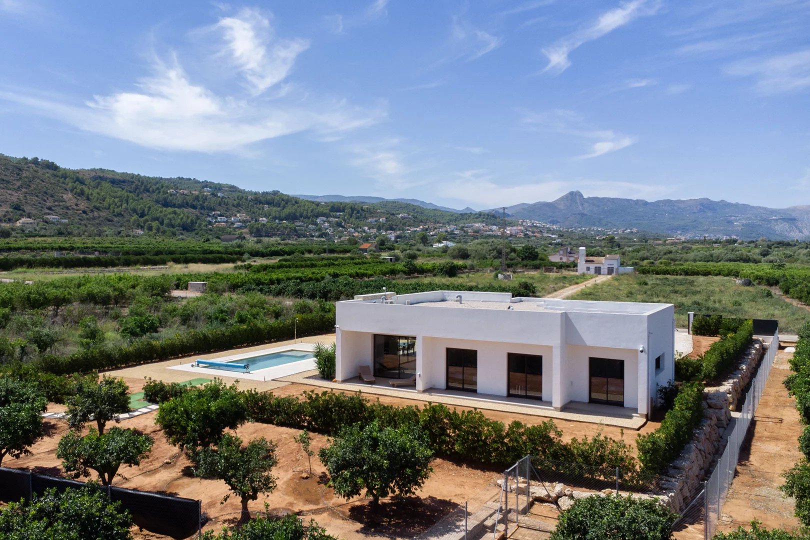 Villa moderne sur grand terrain à vendre à Beniarbeig Villa moderne avec 11.000 m2 de terrain Cette villa exclusive, construite en 2023 selon des normes de qualité élevées, est située dans la paisible vallée d’Orba et offre une vue panoramique à 360° sur les montagnes environnantes, notamment la Sierra de Segaria et le Montgó. La villa dispose d’un salon et d’une salle à manger spacieux avec cuisine ouverte et îlot central. La cuisine est équipée d’appareils électroménagers Bosch haut de gamme et est adjacente à une buanderie pratique. Elle comprend également trois chambres doubles et deux salles de bains. Le salon donne sur une grande terrasse couverte qui borde directement la piscine chauffée (10 x 4 m), où vous pourrez profiter d’une privauté totale. Le terrain de 2.000 m2 est entièrement clôturé et planté d’orangers, de mandariniers, de citronniers et de pamplemoussers. Il y a également un grand parking pouvant accueillir deux voitures sous un auvent. La villa comprend également un verger d’orangers de 9 000 m2, qui est entretenu et récolté gratuitement par une coopérative. Devant la maison se trouve également un grand terrain plat de 3300 m2, qui peut être acheté séparément et qui est idéal pour servir de pâturage pour les animaux. La villa est équipée d’un système d’alarme complet avec caméras intelligentes, de la climatisation, de volets roulants électriques et d’un portail automatique. Si vous le souhaitez, il est possible d’agrandir la villa avec des chambres supplémentaires (plus d’informations sur demande). Le centre commercial La Marina à Ondara et l’accès à l’autoroute se trouvent à seulement 5 minutes en voiture. La longue plage de sable de Denia est accessible en 12 minutes et en une demi-heure, vous pouvez rejoindre les baies idylliques de Jávea et Moraira. La villa idéale pour ceux qui recherchent le calme, la nature et l’espace, à proximité de toutes les commodités.