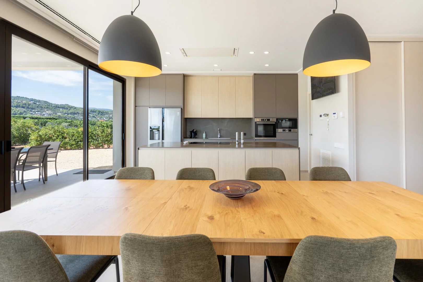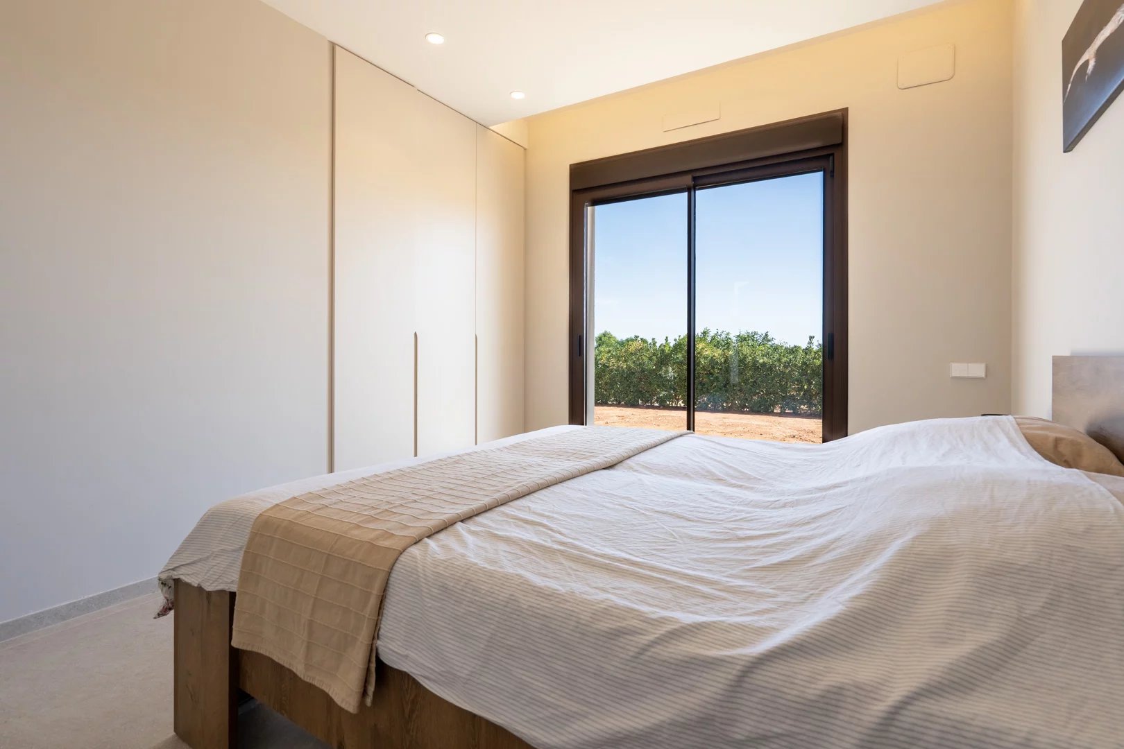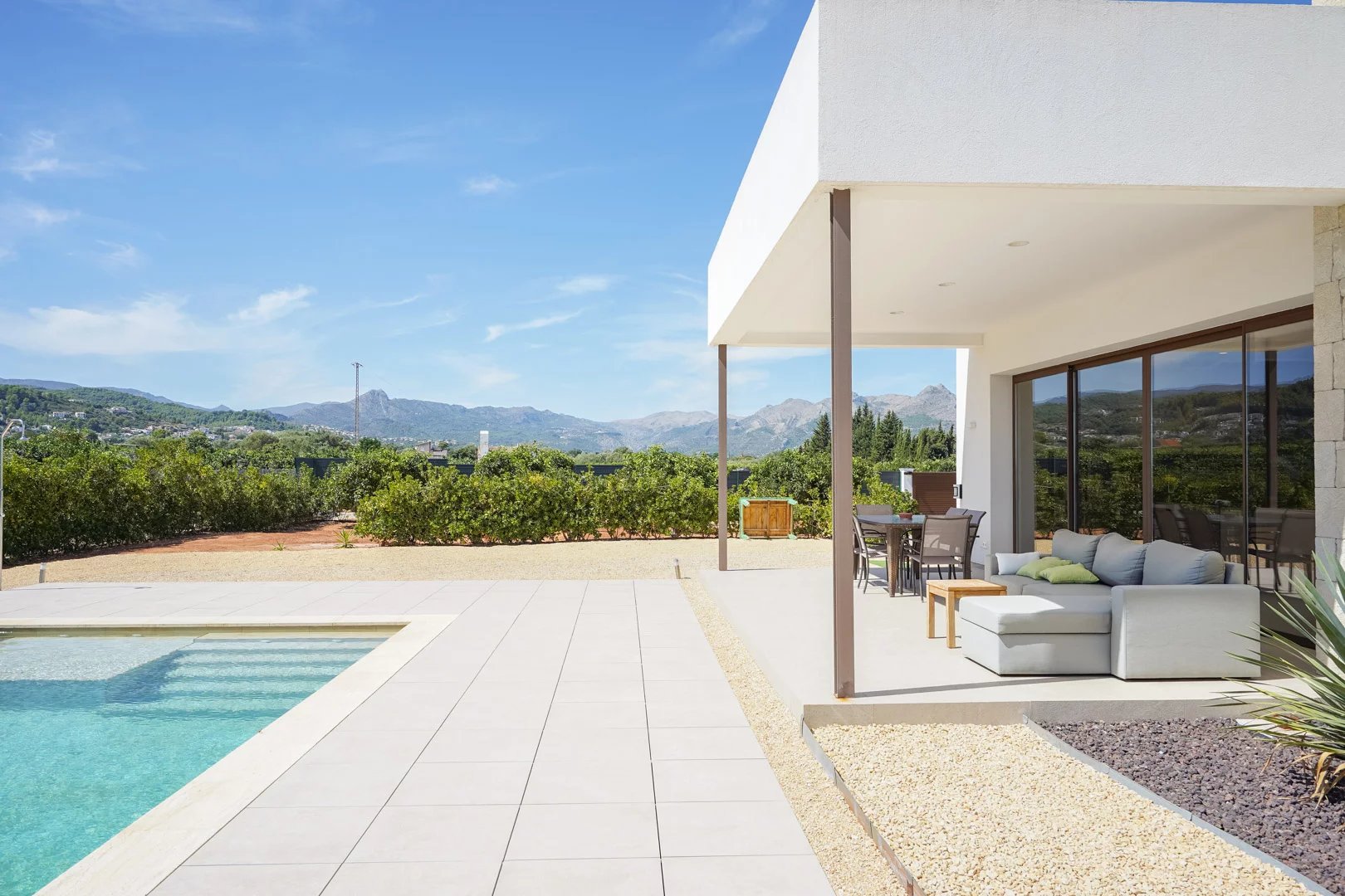Villa moderne sur grand terrain à vendre à Beniarbeig Villa moderne avec 11.000 m2 de terrain Cette villa exclusive, construite en 2023 selon des normes de qualité élevées, est située dans la paisible vallée d’Orba et offre une vue panoramique à 360° sur les montagnes environnantes, notamment la Sierra de Segaria et le Montgó. La villa dispose d’un salon et d’une salle à manger spacieux avec cuisine ouverte et îlot central. La cuisine est équipée d’appareils électroménagers Bosch haut de gamme et est adjacente à une buanderie pratique. Elle comprend également trois chambres doubles et deux salles de bains. Le salon donne sur une grande terrasse couverte qui borde directement la piscine chauffée (10 x 4 m), où vous pourrez profiter d’une privauté totale. Le terrain de 2.000 m2 est entièrement clôturé et planté d’orangers, de mandariniers, de citronniers et de pamplemoussers. Il y a également un grand parking pouvant accueillir deux voitures sous un auvent. La villa comprend également un verger d’orangers de 9 000 m2, qui est entretenu et récolté gratuitement par une coopérative. Devant la maison se trouve également un grand terrain plat de 3300 m2, qui peut être acheté séparément et qui est idéal pour servir de pâturage pour les animaux. La villa est équipée d’un système d’alarme complet avec caméras intelligentes, de la climatisation, de volets roulants électriques et d’un portail automatique. Si vous le souhaitez, il est possible d’agrandir la villa avec des chambres supplémentaires (plus d’informations sur demande). Le centre commercial La Marina à Ondara et l’accès à l’autoroute se trouvent à seulement 5 minutes en voiture. La longue plage de sable de Denia est accessible en 12 minutes et en une demi-heure, vous pouvez rejoindre les baies idylliques de Jávea et Moraira. La villa idéale pour ceux qui recherchent le calme, la nature et l’espace, à proximité de toutes les commodités.