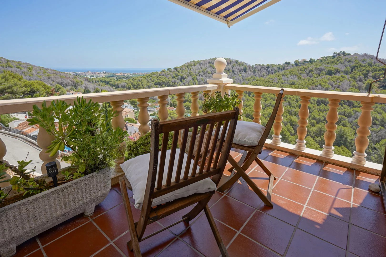 Traditionele villa met zeezicht te koop in Jávea Traditionele villa met zeezicht in Sol de Este, Javea. Deze 4 slaapkamer villa ligt aan het einde van een doodlopende straat, in de rustige urbanisatie Sol de Este. Dankzij de verhoogde ligging geniet de villa van een weids uitzicht over de omliggende bossen en valleien, tot aan de zee, en is absolute privacy gegarandeerd. De woning strekt zich uit over drie verdiepingen. Op de eerste verdieping bevindt zich een ruime woon-eetkamer met een gezellig salon en open haard, een aparte kantoorruimte, een ruime aparte keuken en twee comfortabele slaapkamers die een badkamer delen. Aan de oostzijde ligt een ruime naya, waarvan de noordkant een balkon en aan de zuidkant een groot terras met luifel is. Vanuit de keuken is er directe toegang tot een ruim terras met een ingebouwde barbecue, ideaal voor lange zomeravonden. Op de tweede verdieping bevindt zich de hoofdslaapkamer met een eigen badkamer. De benedenverdieping biedt een extra kamer met een gastentoilet en een bergruimte die reeds voorzien is van aansluitingen voor een keuken, waardoor hier eenvoudig een zelfstandig appartement kan worden gerealiseerd. Deze ruimte biedt bovendien directe toegang tot de garage, die plaats biedt aan twee voertuigen. Indien gewenst kunnen in de garage ook nog extra kamers worden gebouwd. Aangrenzend ligt een overdekt terras dat uitkijkt op het zuidelijk georiënteerde zwembad van wel liefst 53 m2, wat deze verdieping bijzonder aantrekkelijk maakt. Naast de garage zijn er ook meerdere parkeerplaatsen op het eigen terrein aanwezig. Alle kamers zijn uitgerust met airconditioning, gasverwarming via radiatoren, ingebouwde kasten en televisies. Op verschillende plaatsen in de woning is bovendien infraroodverwarming geïnstalleerd, wat bijdraagt aan een energiezuinig verbruik. Bovendien kun je dankzij de vele terrassen steeds een plekje vinden zowel in de zon als in de schaduw. De ligging van de villa is uiterst centraal: binnen vier minuten bereik je het zandstrand van Javea en alle noodzakelijke voorzieningen. Ook de golfclub van Benitachell bevindt zich op slechts enkele minuten afstand, wat deze woning uitermate geschikt maakt als permanente verblijfplaats of als vakantiewoning.