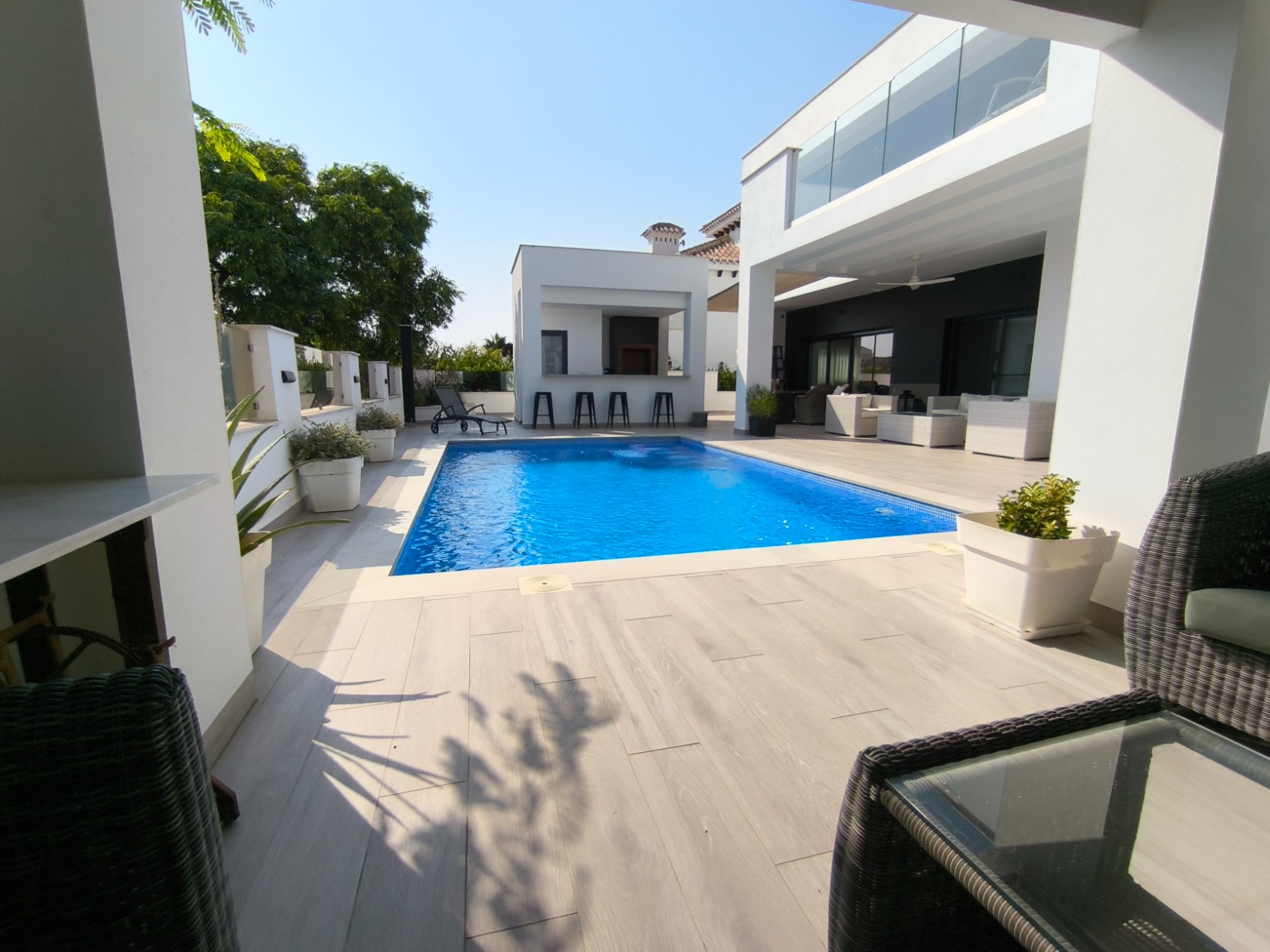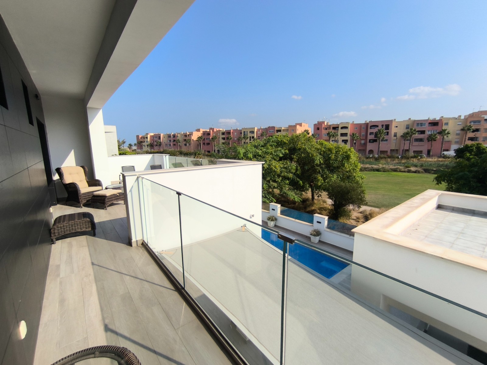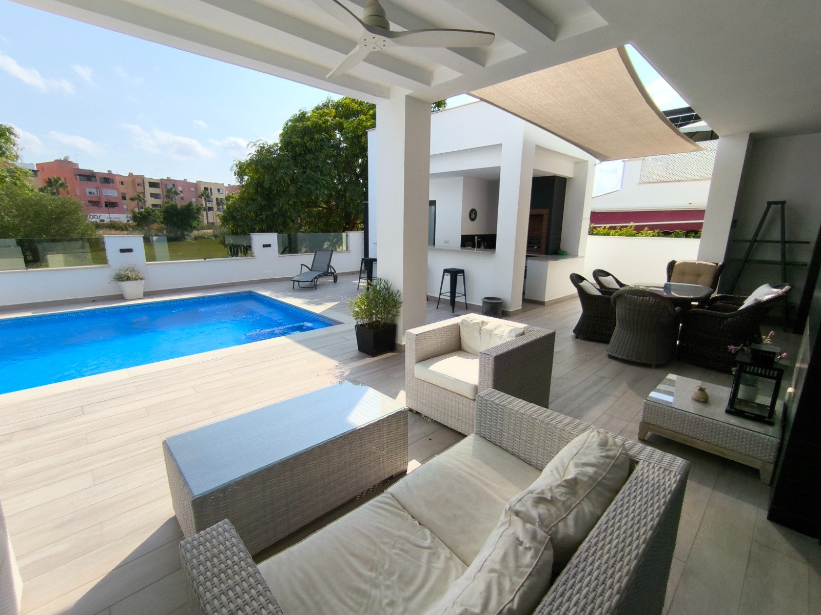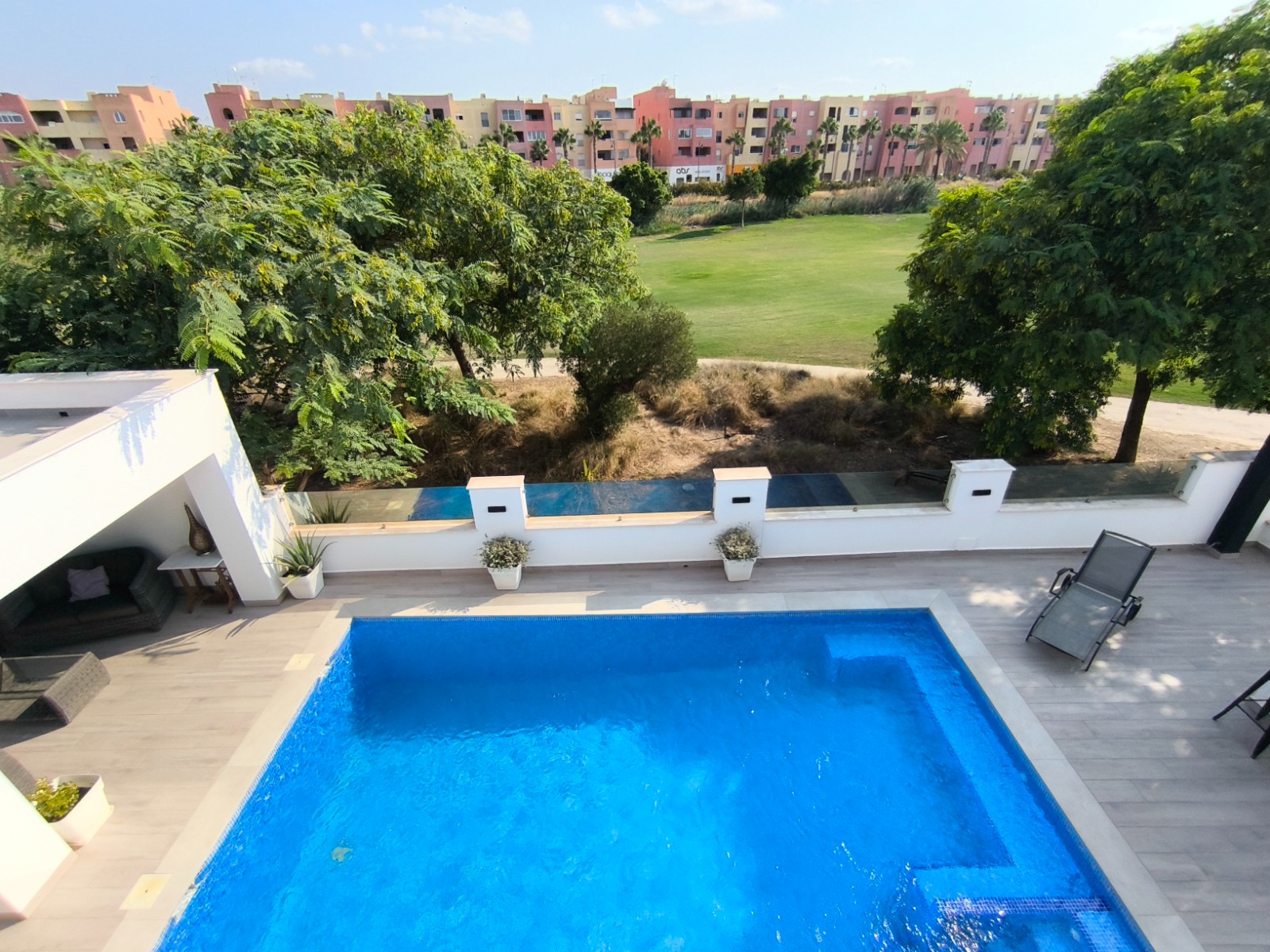 Wij presenteren u een exclusieve villa van in totaal 291 m², uniek door zijn ontwerp en ligging, gelegen op een privéperceel van 400 m² met een prachtig uitzicht op hole 9 van de golfbaan. ✨ Belangrijkste kenmerken: 6 slaapkamers en 5 complete badkamers.Zuidgericht, met de hele dag door natuurlijk licht.Grote privézwembad en buitengedeelte met chill-out zone en overdekte barbecue met bar.Overdekte buitenparkeerplaats met pergola voor 2 auto’s en berging.