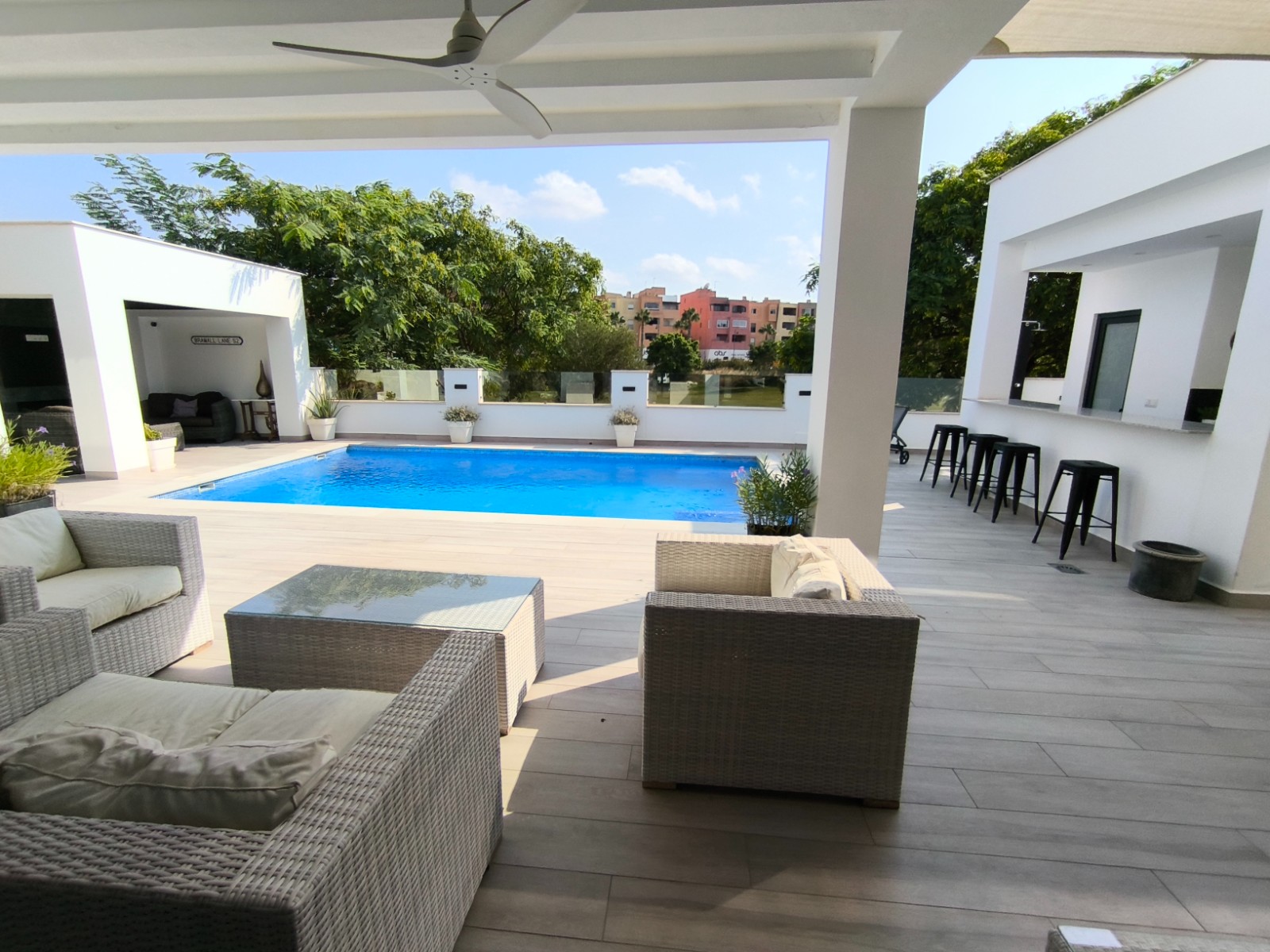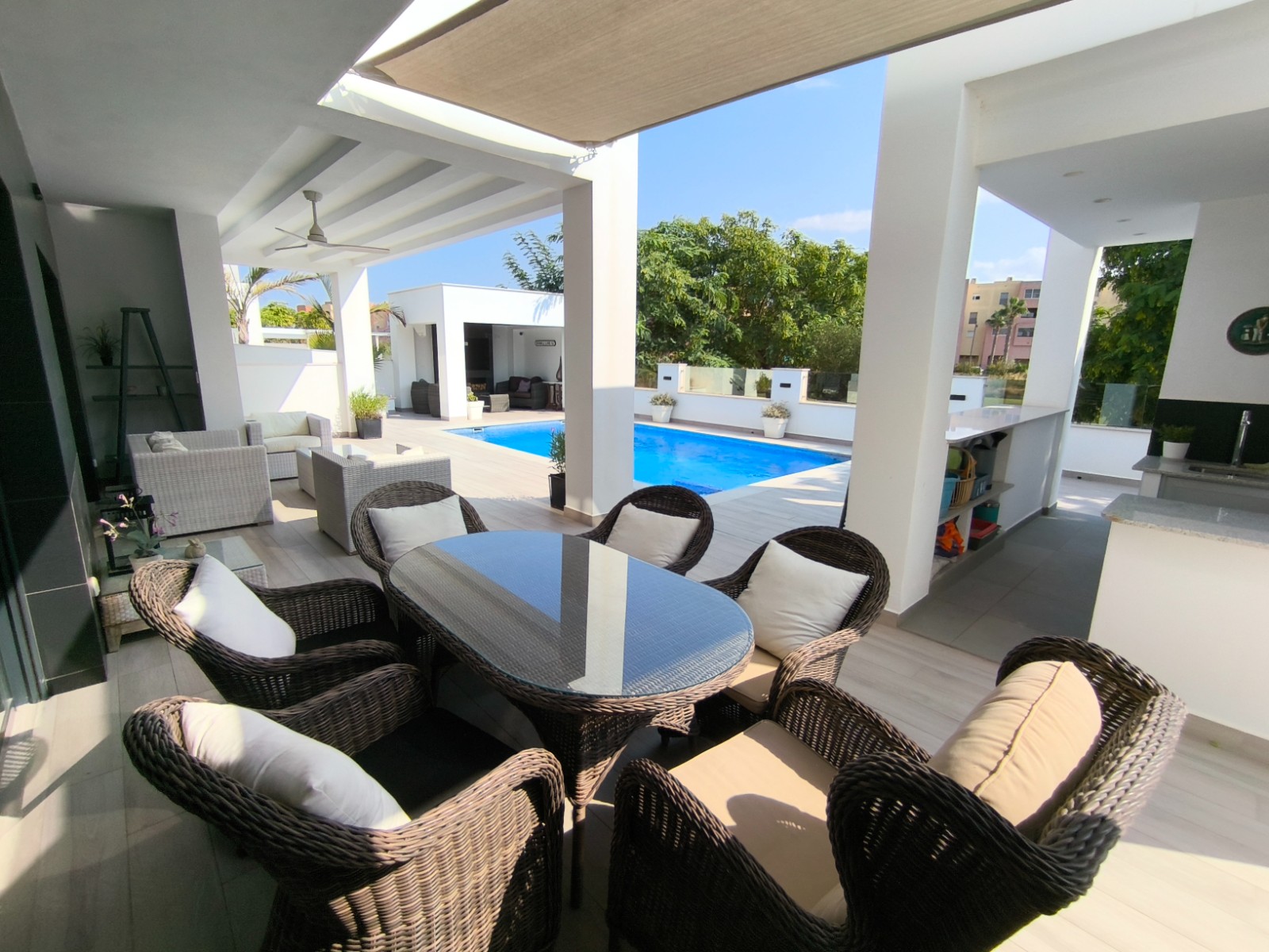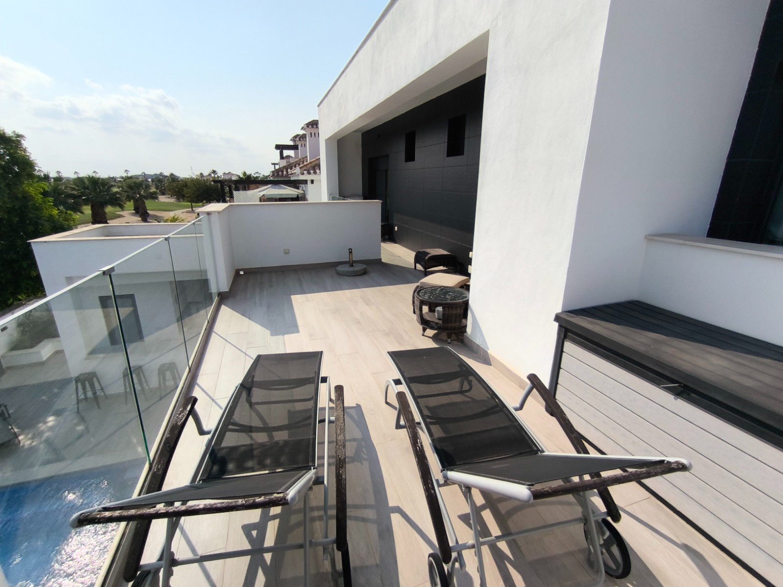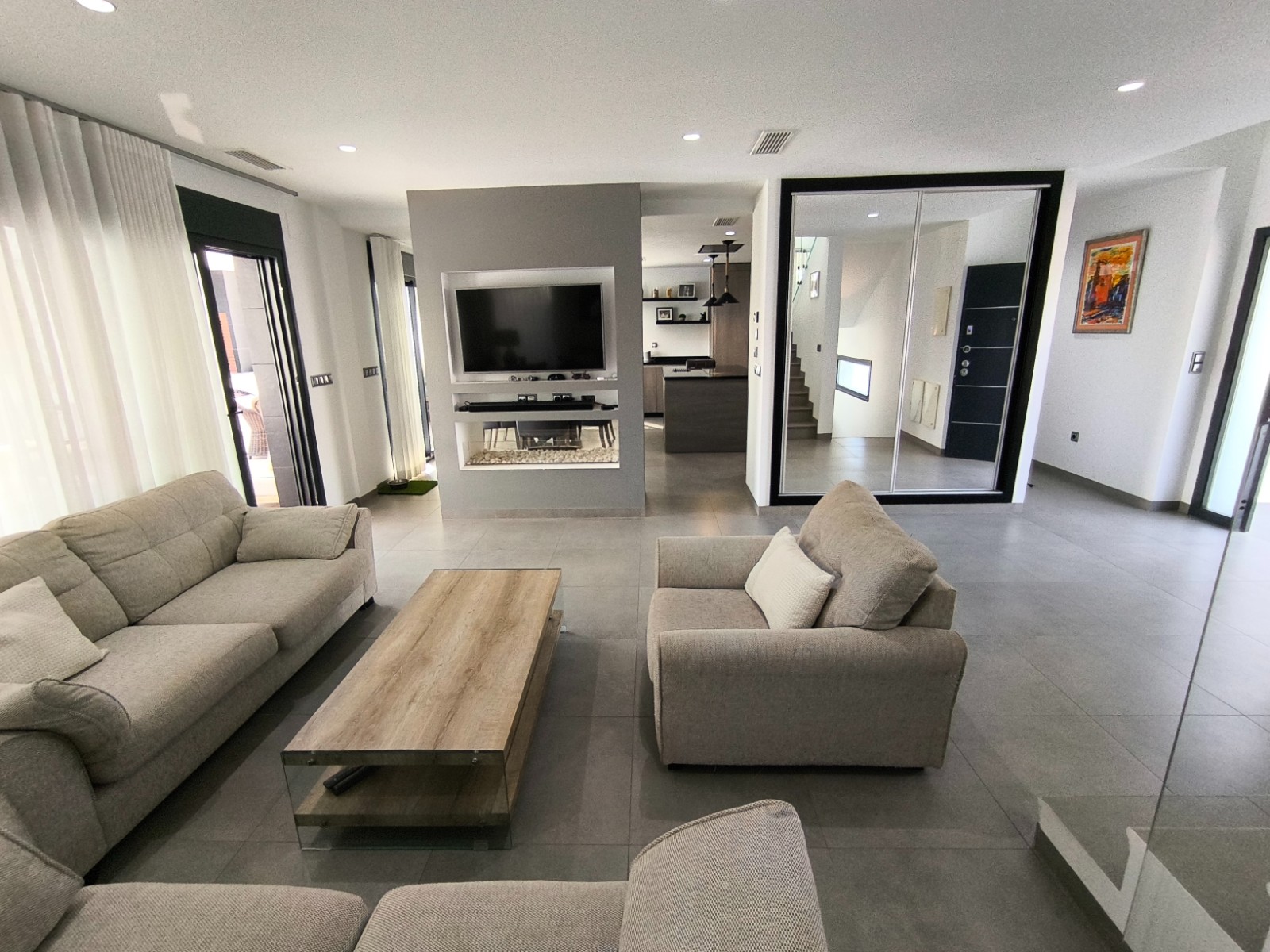 Wij presenteren u een exclusieve villa van in totaal 291 m², uniek door zijn ontwerp en ligging, gelegen op een privéperceel van 400 m² met een prachtig uitzicht op hole 9 van de golfbaan. ✨ Belangrijkste kenmerken: 6 slaapkamers en 5 complete badkamers.Zuidgericht, met de hele dag door natuurlijk licht.Grote privézwembad en buitengedeelte met chill-out zone en overdekte barbecue met bar.Overdekte buitenparkeerplaats met pergola voor 2 auto’s en berging.