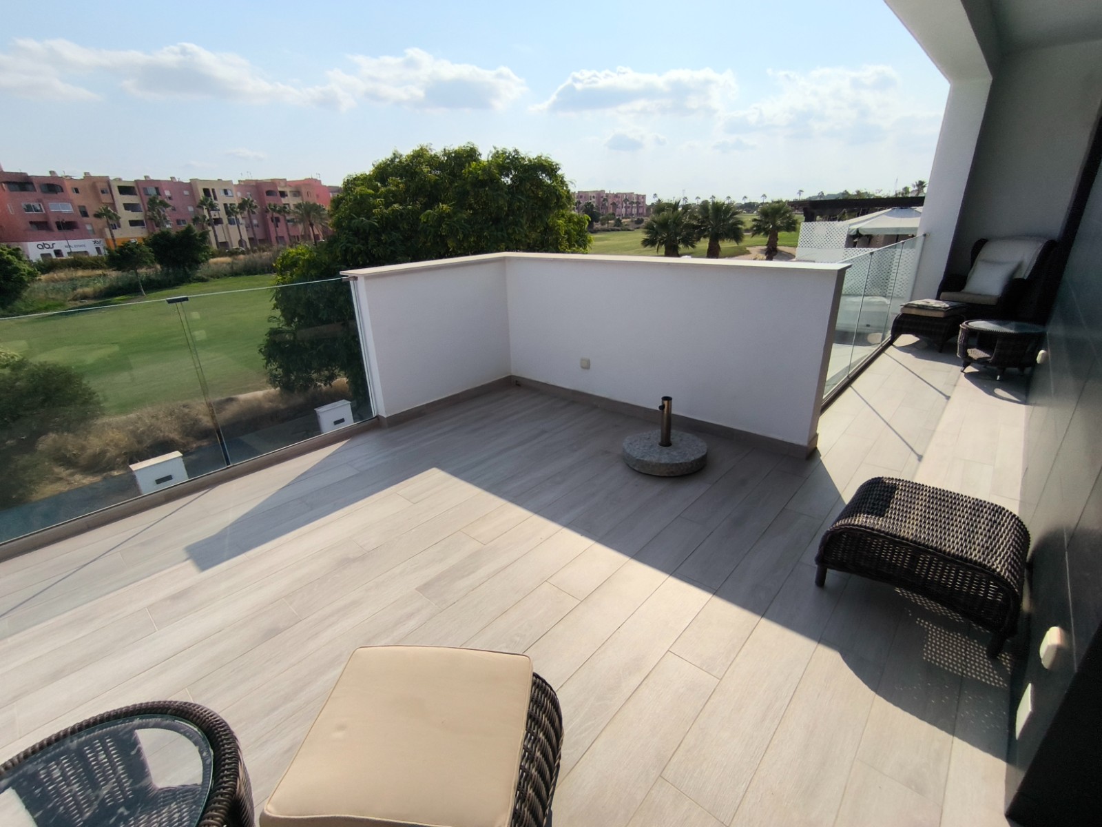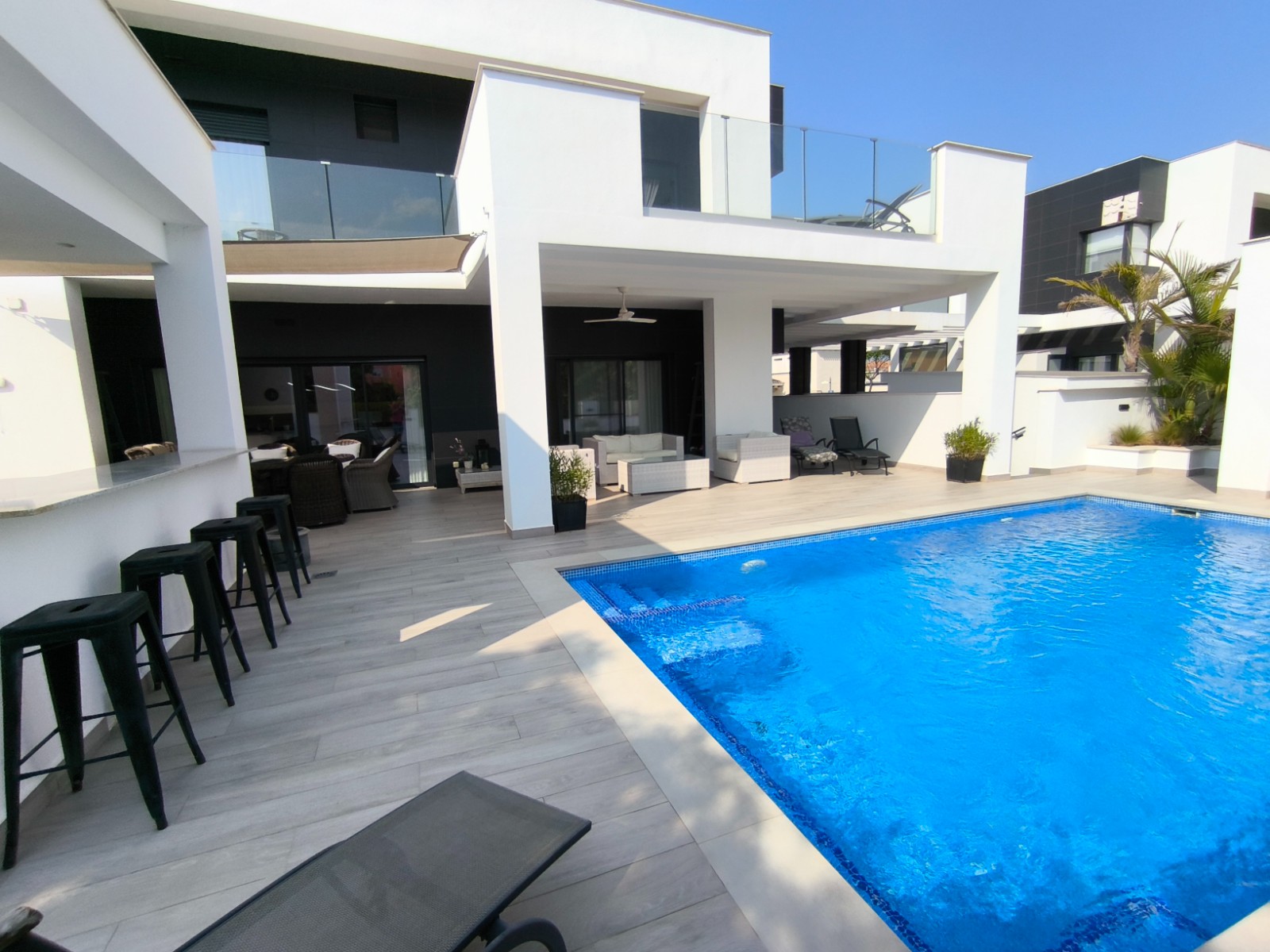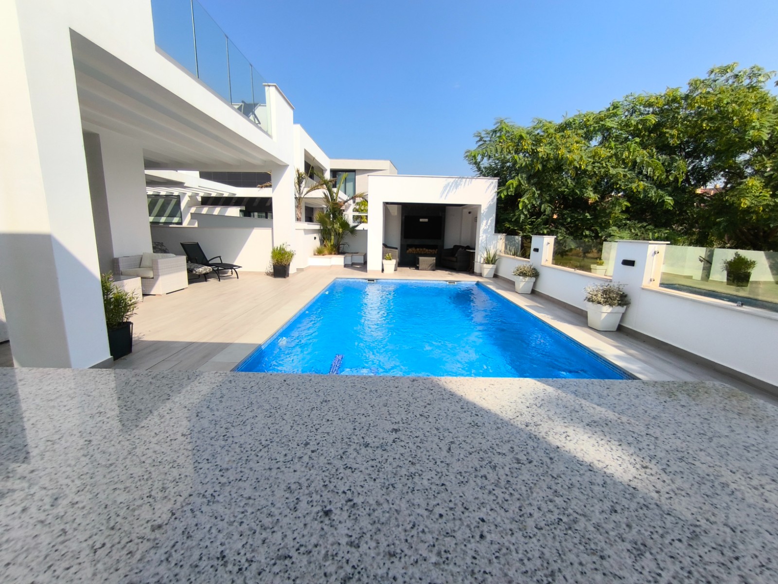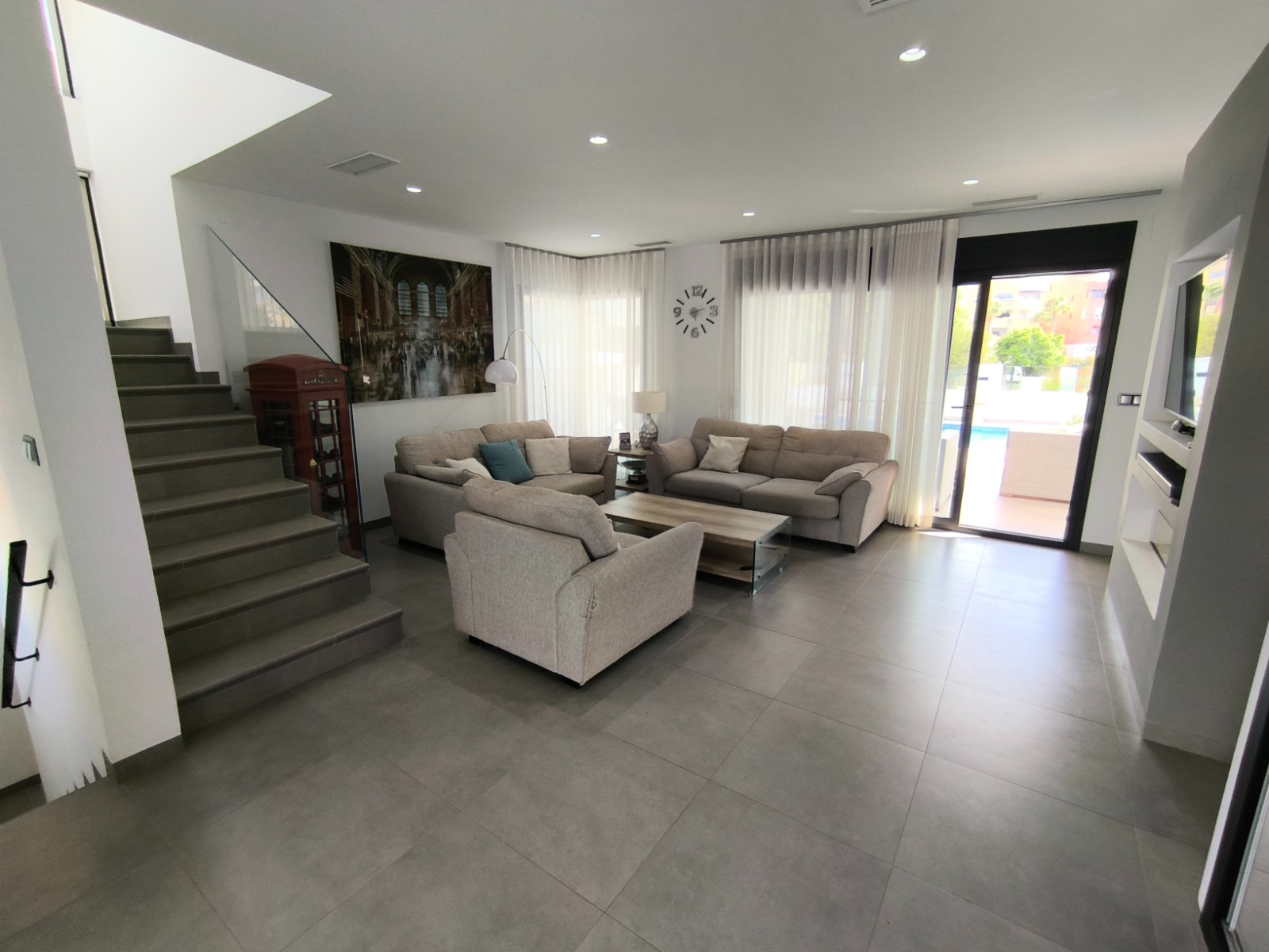 Wij presenteren u een exclusieve villa van in totaal 291 m², uniek door zijn ontwerp en ligging, gelegen op een privéperceel van 400 m² met een prachtig uitzicht op hole 9 van de golfbaan. ✨ Belangrijkste kenmerken: 6 slaapkamers en 5 complete badkamers.Zuidgericht, met de hele dag door natuurlijk licht.Grote privézwembad en buitengedeelte met chill-out zone en overdekte barbecue met bar.Overdekte buitenparkeerplaats met pergola voor 2 auto’s en berging.